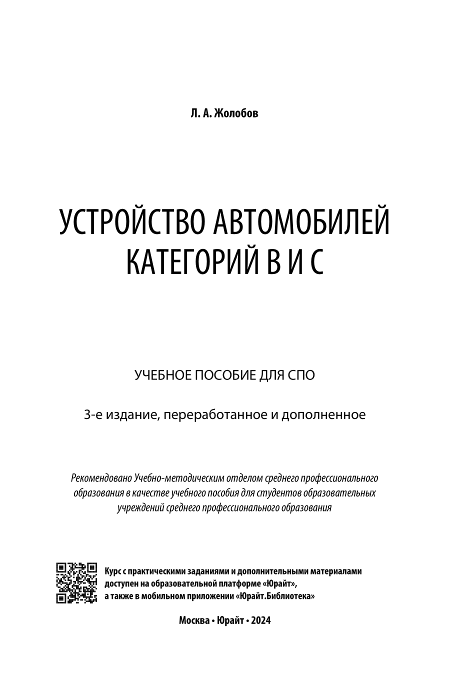 Устройство автомобилей категорий B и C 3-е изд. пер. и доп. Учебное пособие для СПО (Лев Алексеевич Жолобов); ЮРАЙТ, 2023