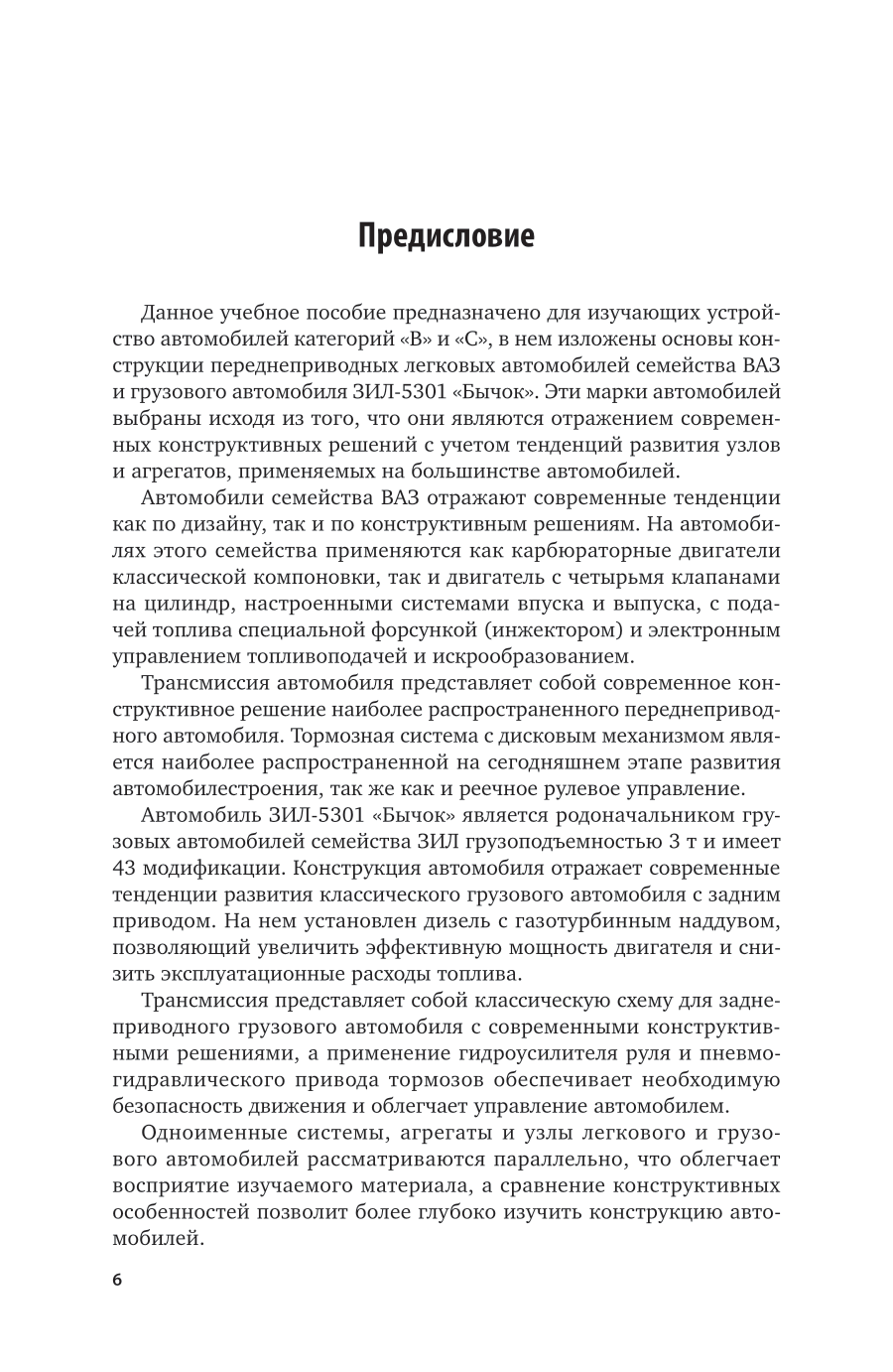 Книга, которую Вы держите в руках, предназначена для тех, кто изучает устройство автомобилей категорий «В» и «С». В ней изложены основы конструкции переднеприводных легковых автомобилей семейства ВАЗ и грузового автомобиля ЗИЛ-5301 «Бычок». Эти марки автомобилей выбраны исходя из того, что они являются отражением современных конструктивных решений с учетом тенденций развития узлов и агрегатов, применяемых на большинстве автомобилей. Одноименные системы, агрегаты и узлы легкового и грузового автомобилей рассматриваются параллельно, что облегчает восприятие изучаемого материала, а сравнение конструктивных особенностей позволит более глубоко изучить конструкцию автомобилей.