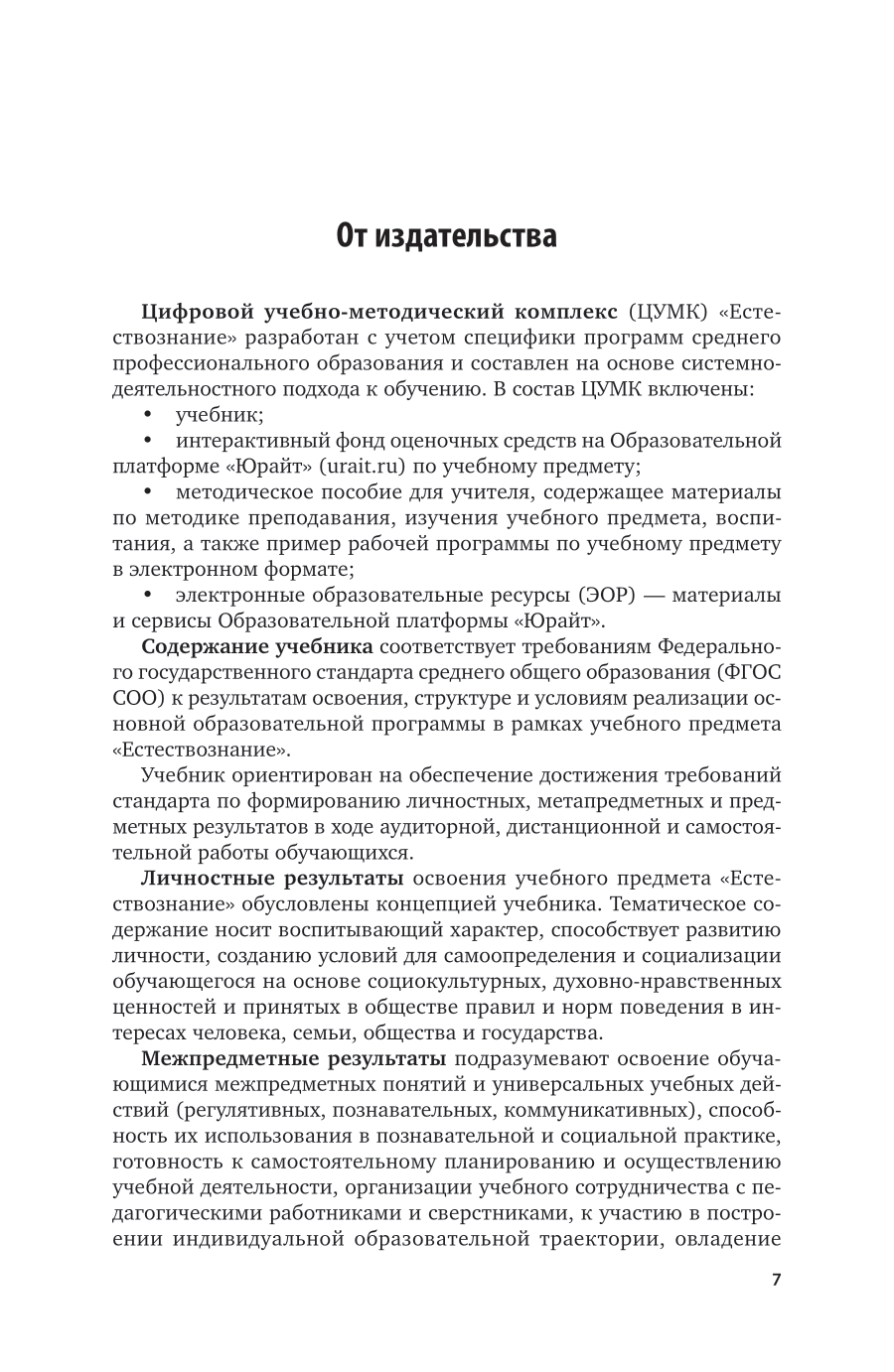 Учебник отражает особенности естественнонаучного познания, показано его место в системе современной науки и культуры. В книге представлена история становления концепций, объясняющих сущность процессов и явлений в живой и неживой природе; охарактеризованы современные научные методы познания мира. Основное внимание уделено изложению ведущих идей, характеризующих науку начала XXI в. и играющих важную роль в становлении мировоззренческой и профессиональной культуры. Учебник ориентирован на среднее общее образование в пределах освоения образовательной программы СПО на базе основного общего образования.
