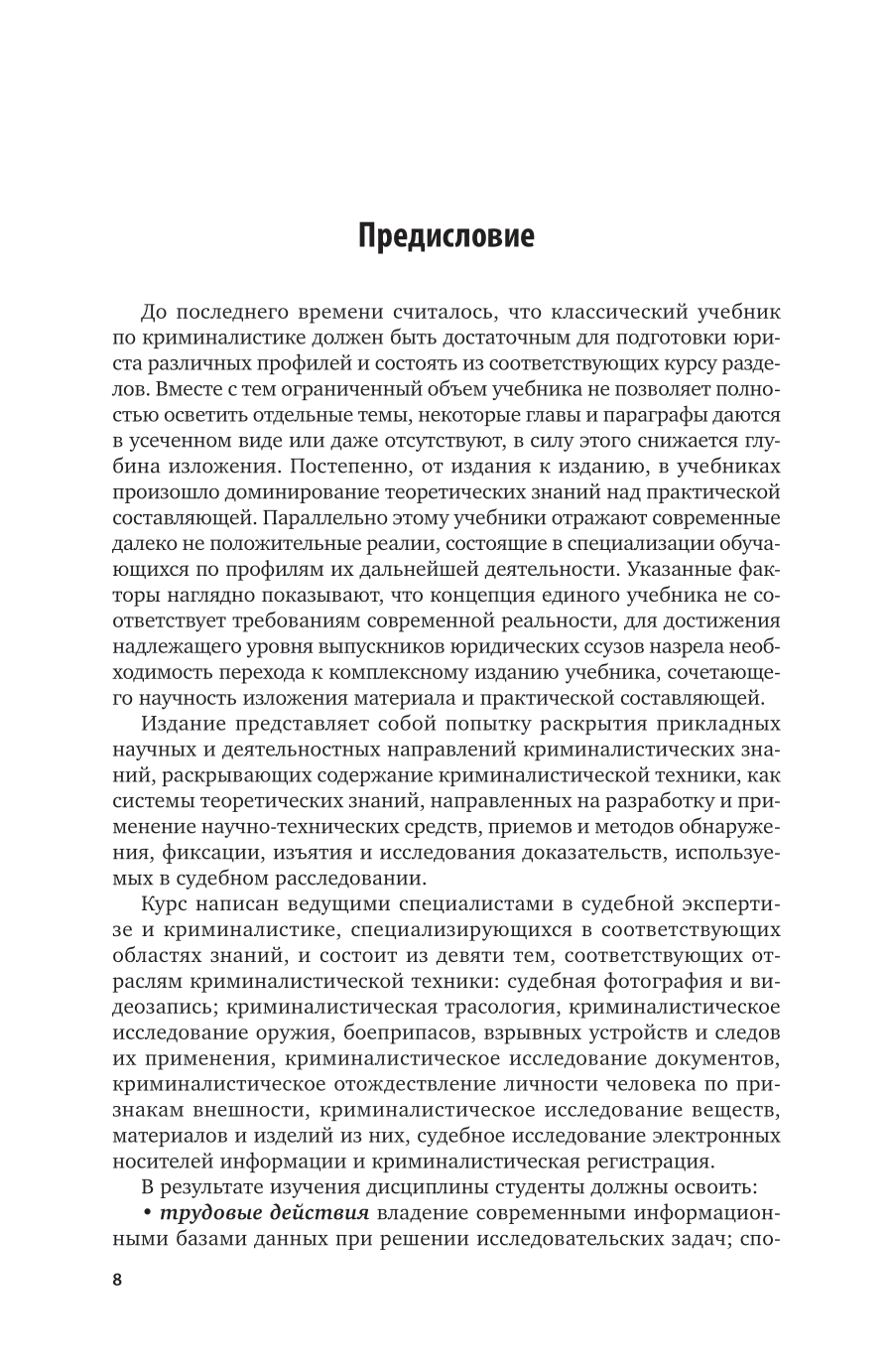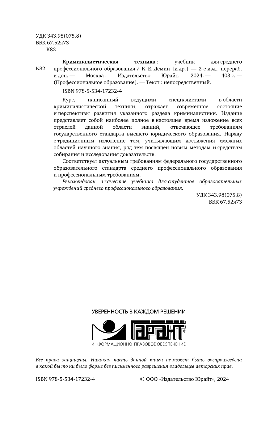 Курс, написанный ведущими специалистами в области криминалистической техники, отражает современное состояние и перспективы развития указанного раздела криминалистики. Издание представляет собой наиболее полное в настоящее время изложение всех отраслей данной области знаний, отвечающее требованиям государственного стандарта высшего юридического образования. Наряду с традиционным изложение тем, учитывающим достижения смежных областей научного знания, ряд тем посвящен новым методам и средствам собирания и исследования доказательств. Соответствует актуальным требованиям федерального государственного образовательного стандарта среднего профессионального образования и профессиональным требованиям. Рекомендован в качестве учебника для студентов образовательных учреждений среднего профессионального образования.