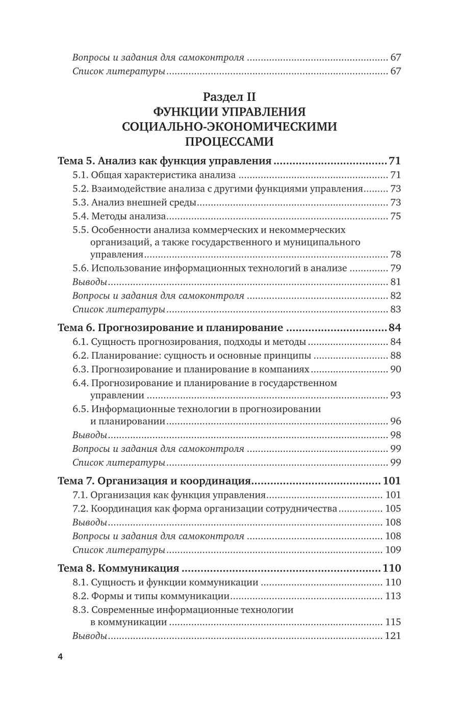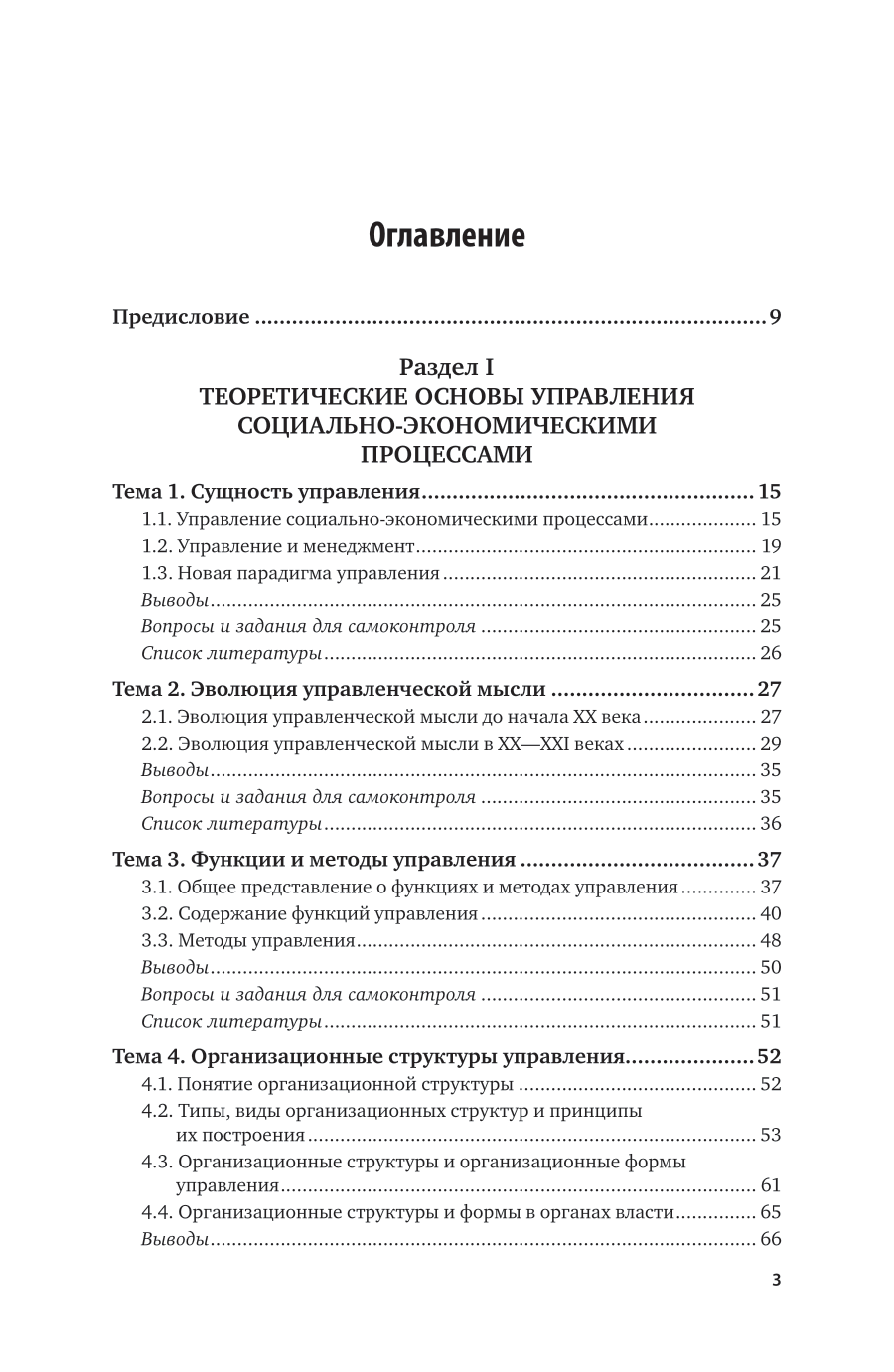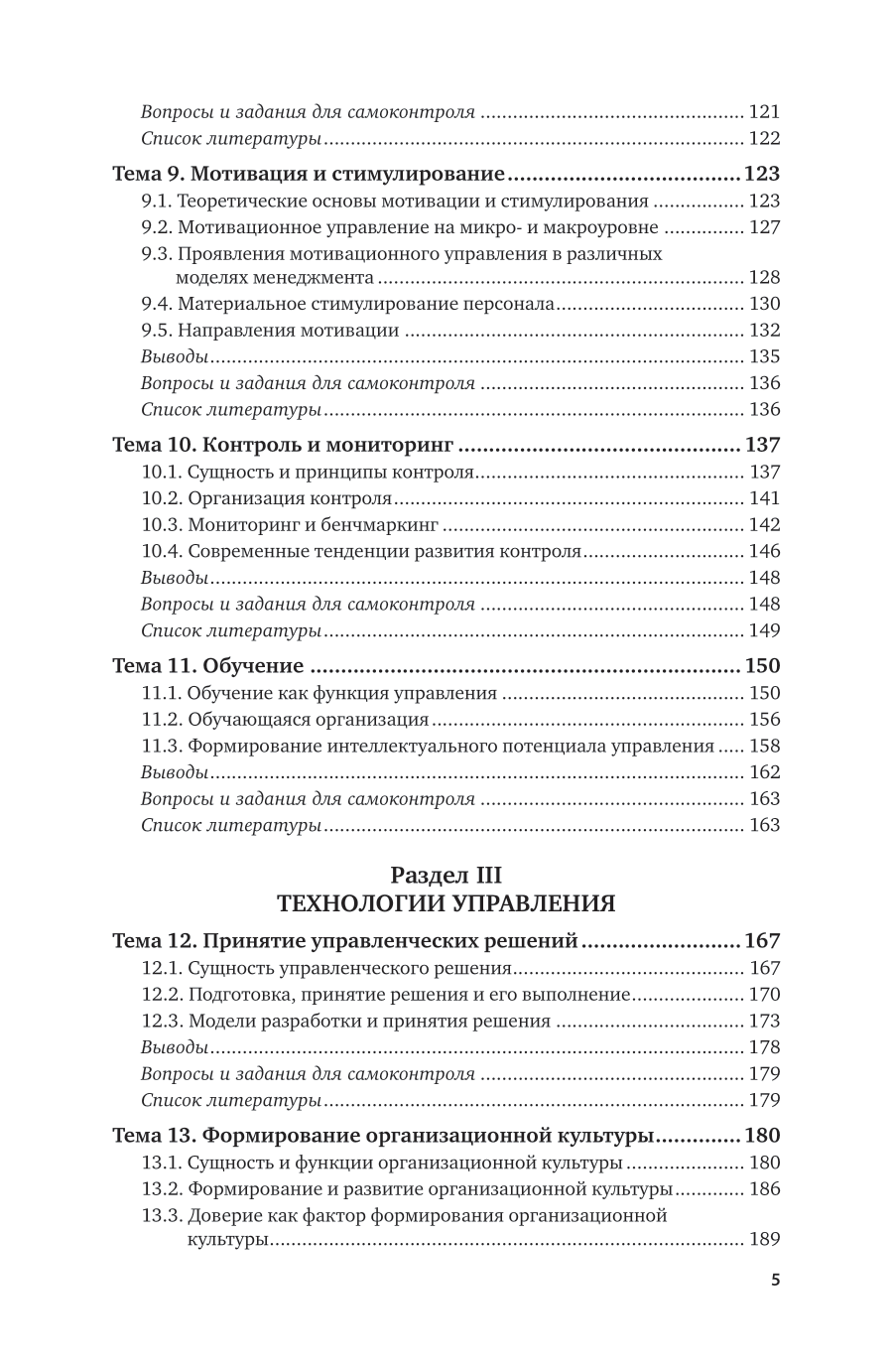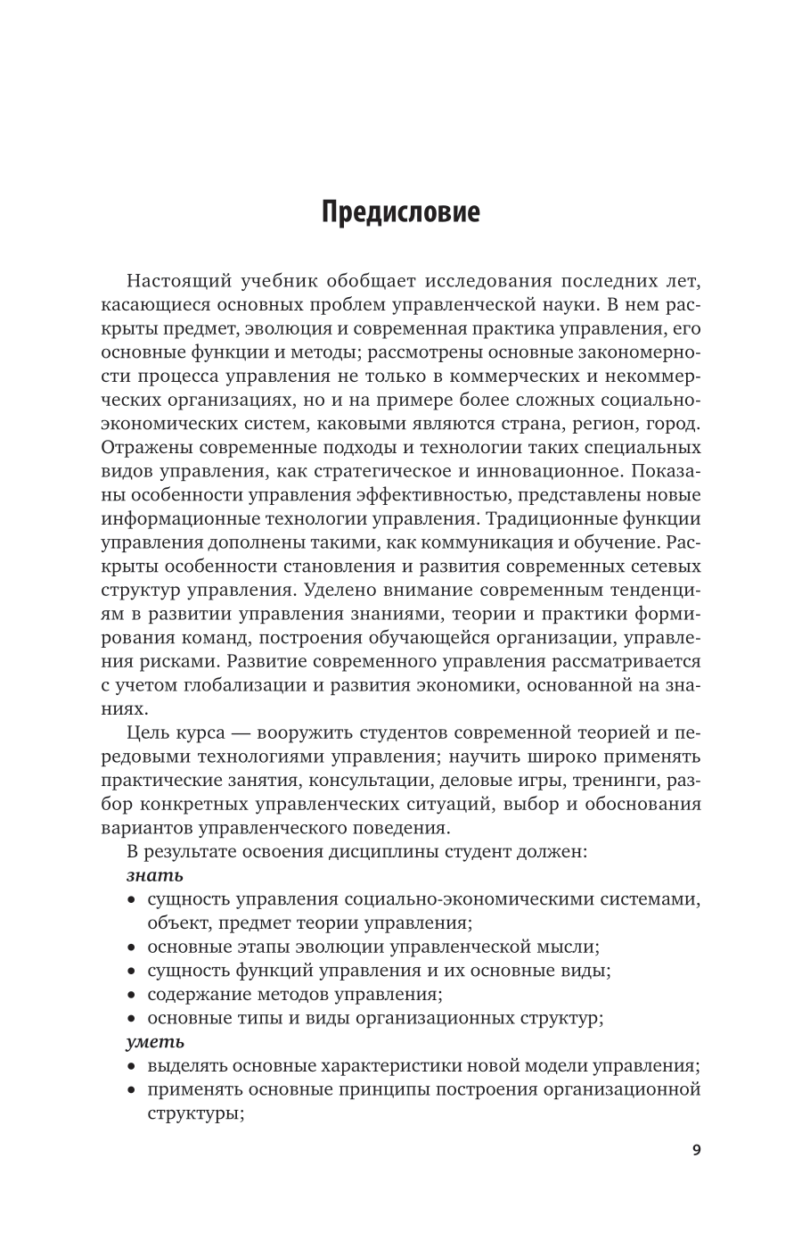 Курс обобщает исследования последних лет, касающиеся основных проблем управленческой науки. В нем раскрыты предмет, эволюция и современная практика управления, его основные функции и методы; рассмотрены основные закономерности процесса управления; отражены современные подходы и технологии таких специальных видов управления, как стратегическое и инновационное. Развитие современного управления рассматривается с учетом глобализации и развития экономики, основанной на знаниях. Изложение материала базируется на отечественных и зарубежных примерах. Каждая тема снабжена краткими выводами, контрольными вопросами и заданиями. В конце курса помещен глоссарий. Соответствует актуальным требованиям федерального государственного образовательного стандарта высшего образования. Для студентов высших учебных заведений, обучающихся по экономическим направлениям.