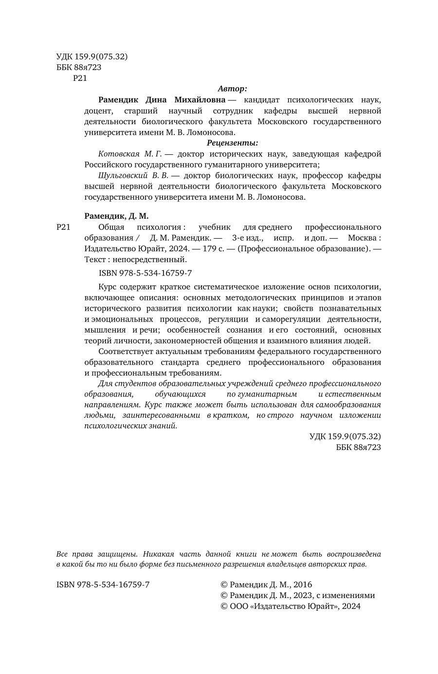 Общая психология 3-е изд. испр. и доп. Учебник для СПО (Дина Михайловна Рамендик); ЮРАЙТ, 2023