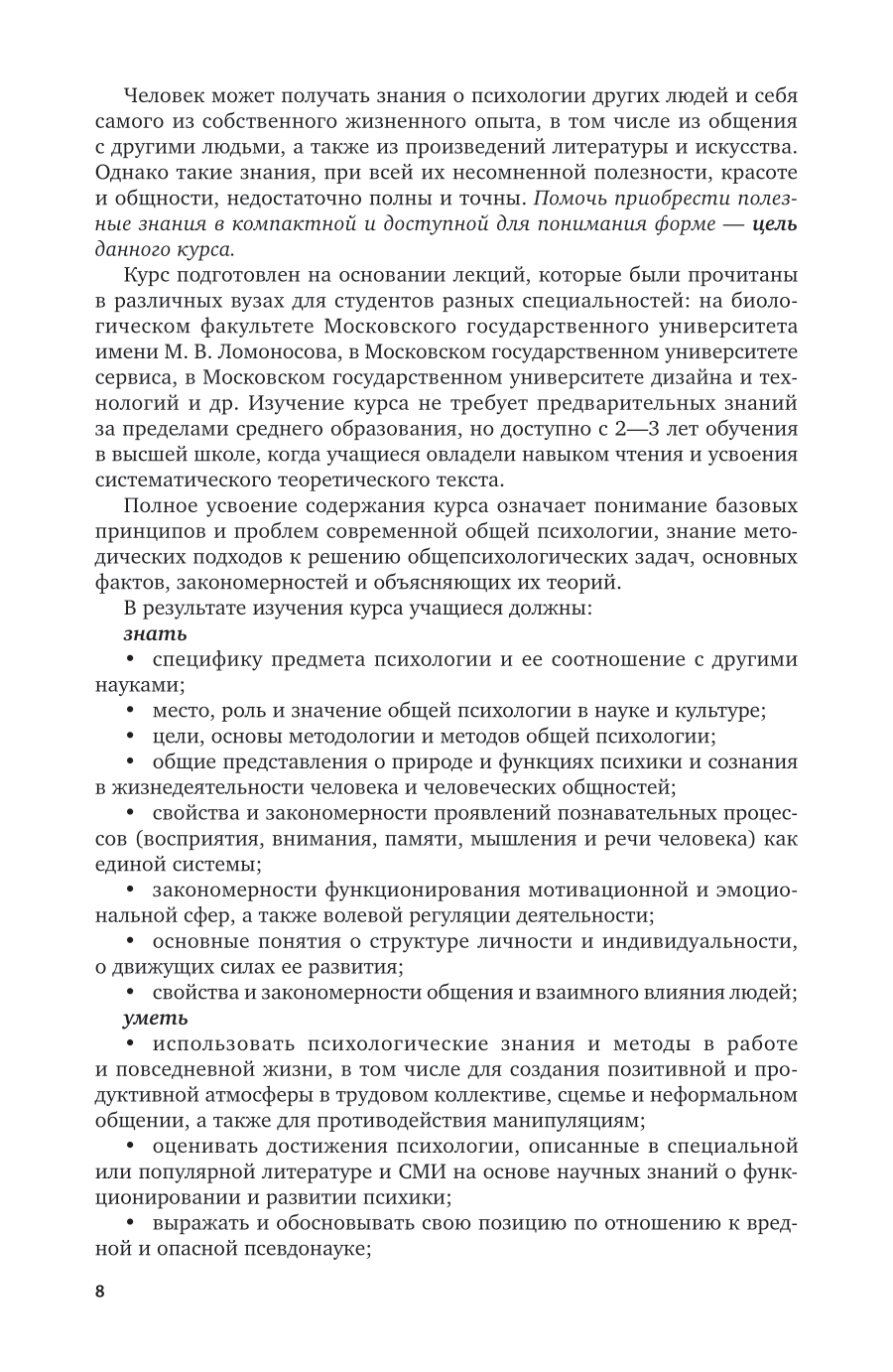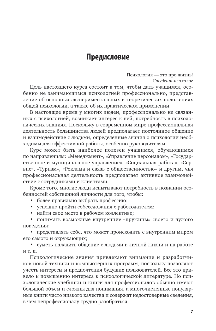 Курс содержит краткое систематическое изложение основ психологии, включающее описания: основных методологических принципов и этапов исторического развития психологии как науки; свойств познавательных и эмоциональных процессов, регуляции и саморегуляции деятельности, мышления и речи; особенностей сознания и его состояний, основных теорий личности, закономерностей общения и взаимного влияния людей. Соответствует актуальным требованиям федерального государственного образовательного стандарта среднего профессионального образования и профессиональным требованиям. Для студентов образовательных учреждений среднего профессионального образования, обучающихся по гуманитарным и естественным направлениям. Курс также может быть использован для самообразования людьми, заинтересованными в кратком, но строго научном изложении психологических знаний.