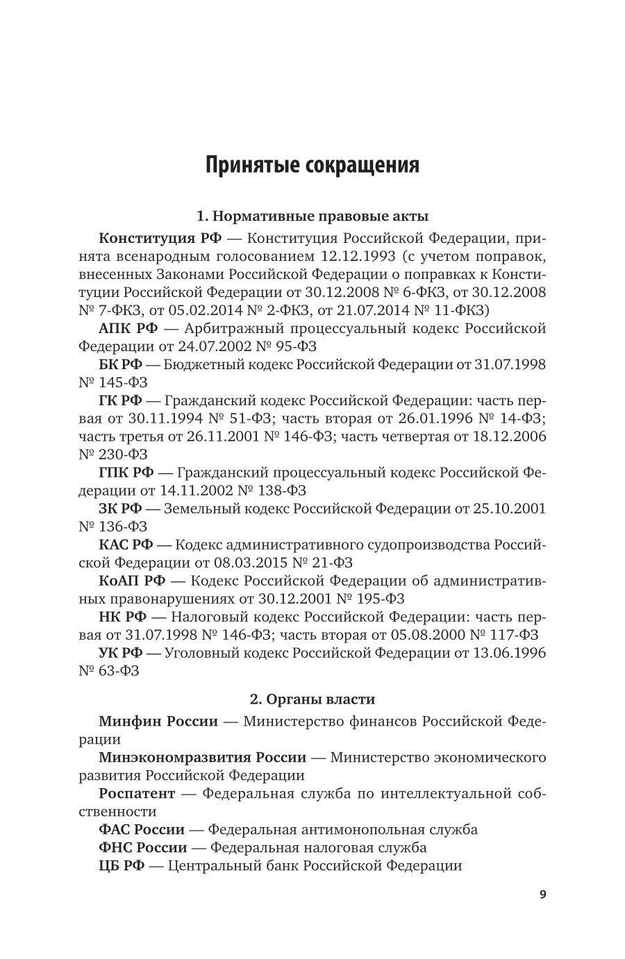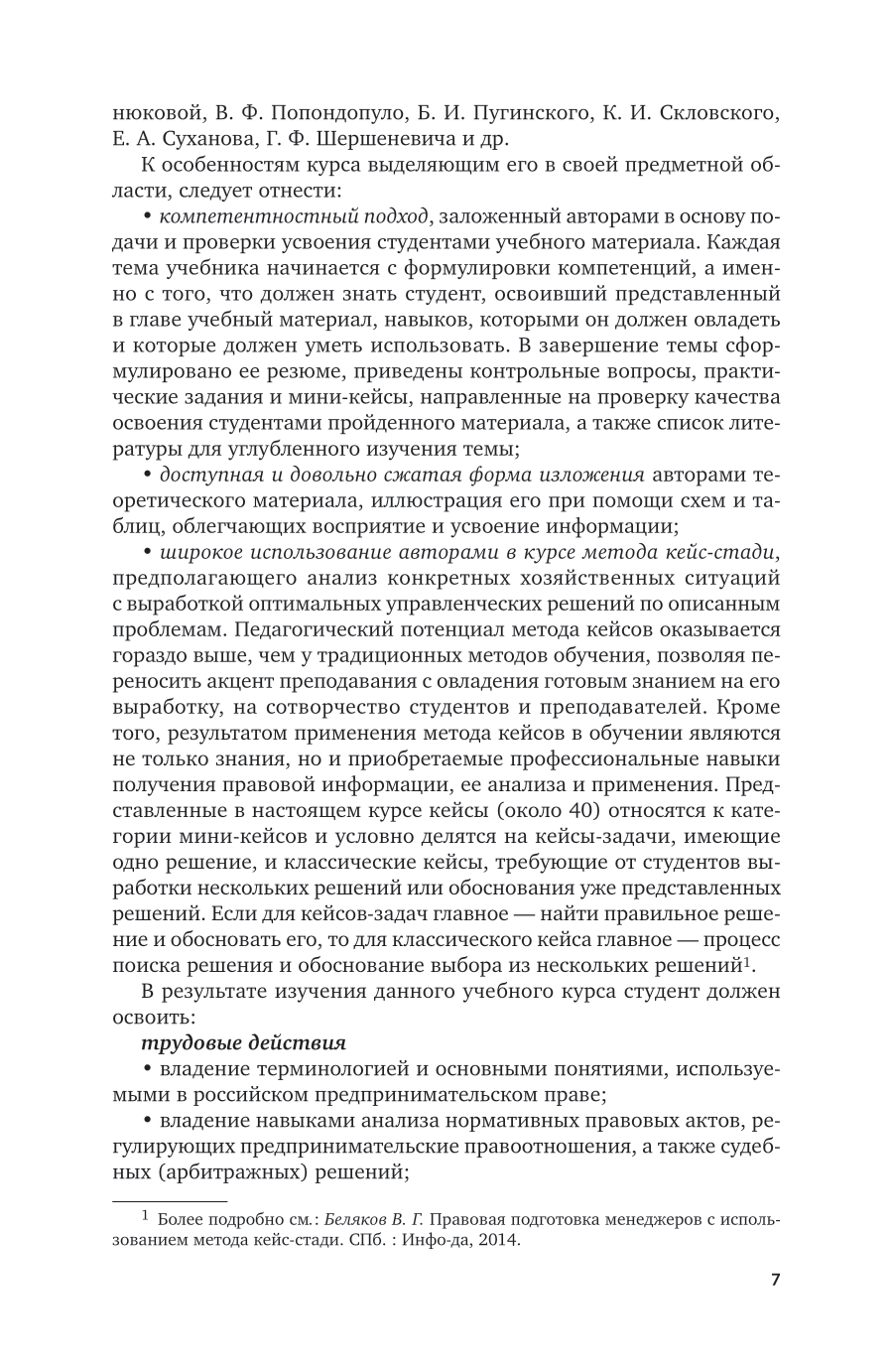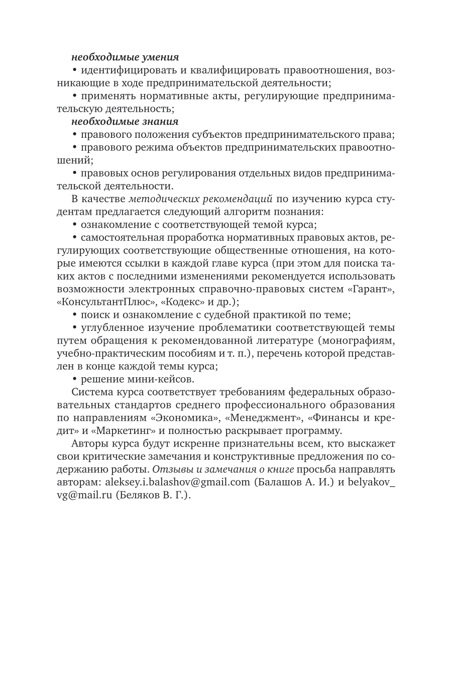 Главная цель настоящего учебника помочь студентам-экономистам овладеть знаниями в области предпринимательского права, а также смежных отраслях частного и публичного права, регулирующих ведение бизнеса. Несомненными достоинствами данного издания являются четкость формулировок и методически выверенное изложение сложного юридического материала. В основу его подачи положен компетентностный подход. Проверить полученные теоретические знания студенты могут с помощью контрольных вопросов и кейсов, представленных ко всем главам учебника. Проанализировав конкретные хозяйственные ситуации, студенты имеют возможность приобрести необходимые для практической работы навыки принятия экономически оптимальных и юридически грамотных управленческих решений. Поэтому учебник будет интересен и полезен не только студентам, но и предпринимателям, руководителям и специалистам коммерческих структур. Данный учебник хорошая база для изучения курса и подготовки к текущей и итоговой аттестации по дисциплине.