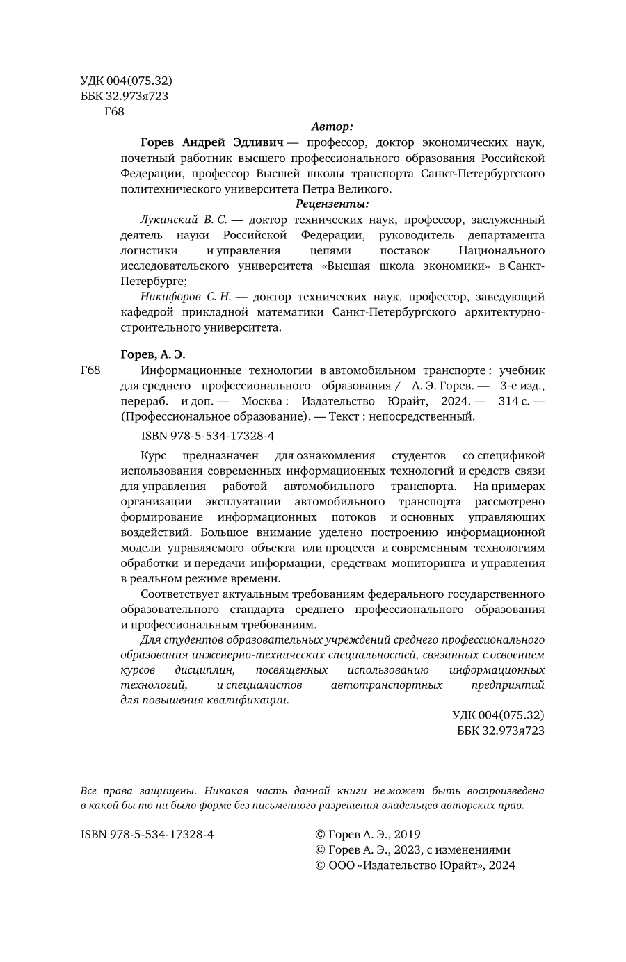 Информационные технологии в автомобильном транспорте 3-е изд. пер. и доп. Учебник для СПО (Андрей Эдливич Горев); ЮРАЙТ, 2023