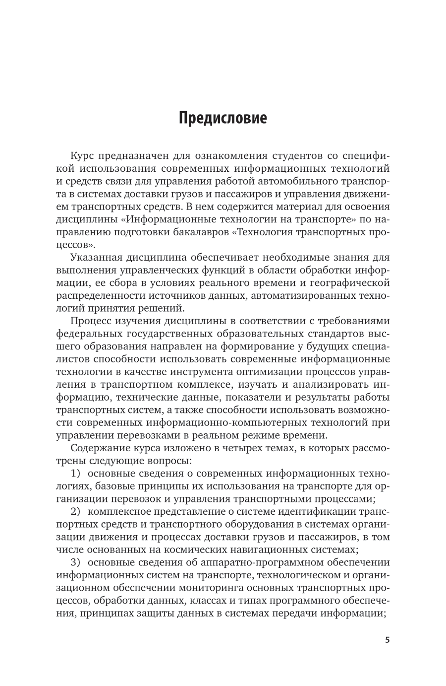 Курс предназначен для ознакомления студентов со спецификой использования современных информационных технологий и средств связи для управления работой автомобильного транспорта. На примерах организации эксплуатации автомобильного транспорта рассмотрено формирование информационных потоков и основных управляющих воздействий. Большое внимание уделено построению информационной модели управляемого объекта или процесса и современным технологиям обработки и передачи информации, средствам мониторинга и управления в реальном режиме времени. Соответствует актуальным требованиям федерального государственного образовательного стандарта среднего профессионального образования и профессиональным требованиям. Для студентов образовательных учреждений среднего профессионального образования инженерно-технических специальностей, связанных с освоением курсов дисциплин, посвященных использованию информационных технологий, и специалистов автотранспортных предприятий для повышения квалификации.