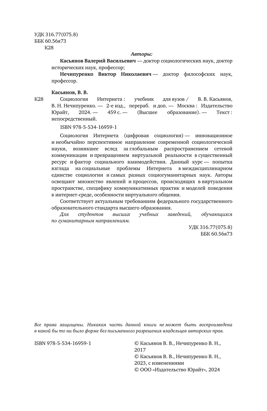 Социология Интернета 2-е изд. пер. и доп. Учебник для вузов (Виктор Николаевич Нечипуренко); ЮРАЙТ, 2023