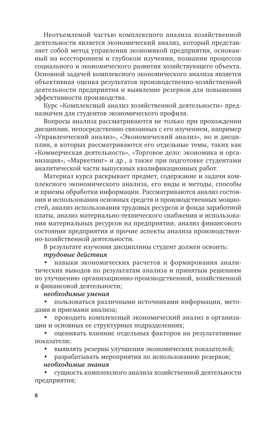 Данный курс раскрывает основные понятия, цель и задачи комплексного экономического анализа, его методы, приемы и способы обработки информации. Последовательно излагается анализ всех сторон хозяйственной деятельности предприятия, начиная от организационно-технического уровня производства, состояния и использования основных средств и производственных мощностей и заканчивая анализом финансового состояния и деловой активности предприятия. Кроме того, авторы уделяют особое внимание маркетинговому анализу, так как без изучения факторов микро- и макросреды предприятиям и организациям сложно планировать свою деятельность и эффективно работать на рынке. В дополнение к теоретической информации в учебнике даются методики расчета ключевых показателей. Соответствует актуальным требованиям федерального государственного образовательного стандарта среднего профессионального образования и профессиональным требованиям. Для студентов образовательных учреждений среднего профессионального образования.