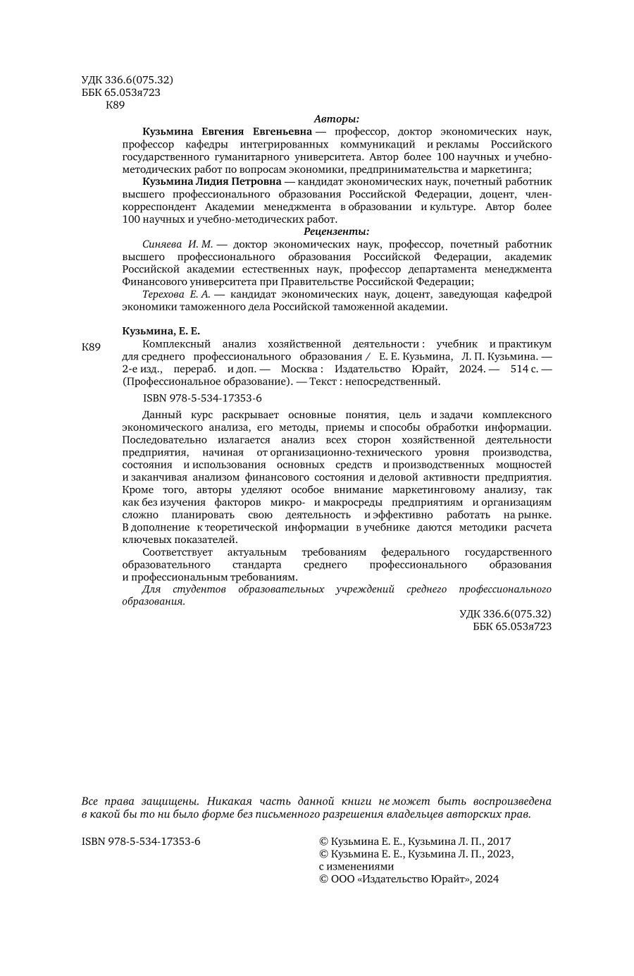 Комплексный анализ хозяйственной деятельности 2-е изд. пер. и доп. Учебник и практикум для СПО (Евгения Евгеньевна Кузьмина); ЮРАЙТ, 2023