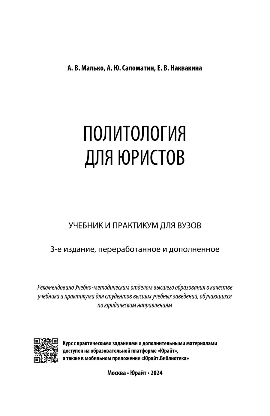 Политология для юристов 3-е изд. пер. и доп. Учебник и практикум для вузов (Малько Александр Васильевич, Саломатин Алексей Юрьевич, Наквакина Екатерина Владимировна), 2023