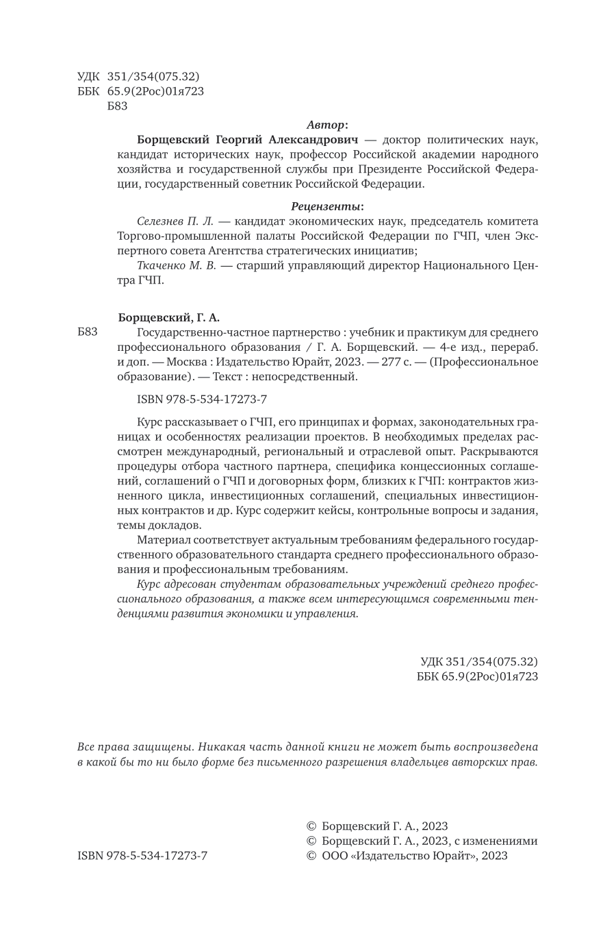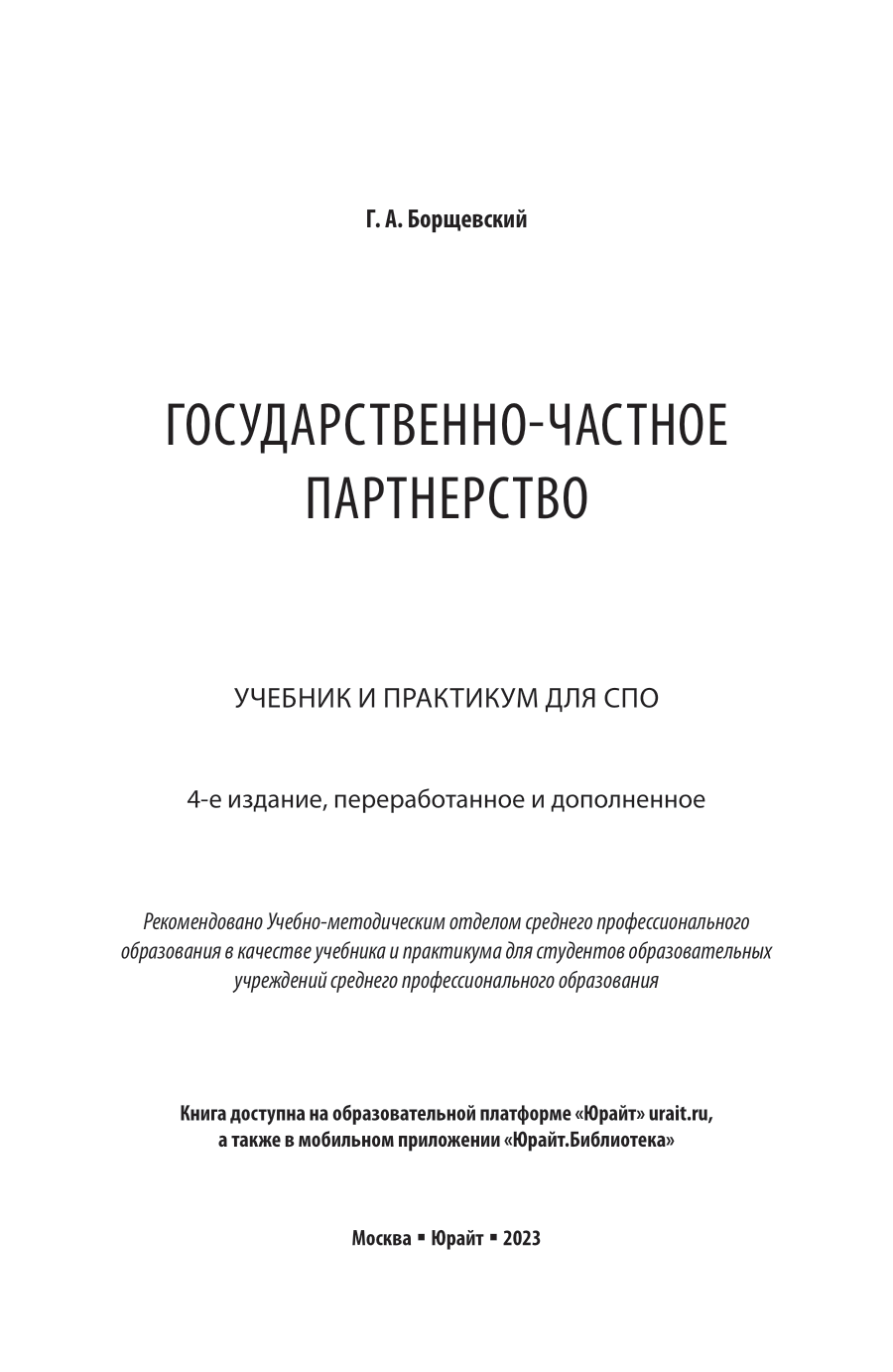 Государственно-частное партнерство 4-е изд. пер. и доп. Учебник и практикум для СПО (Георгий Александрович Борщевский); ЮРАЙТ, 2024