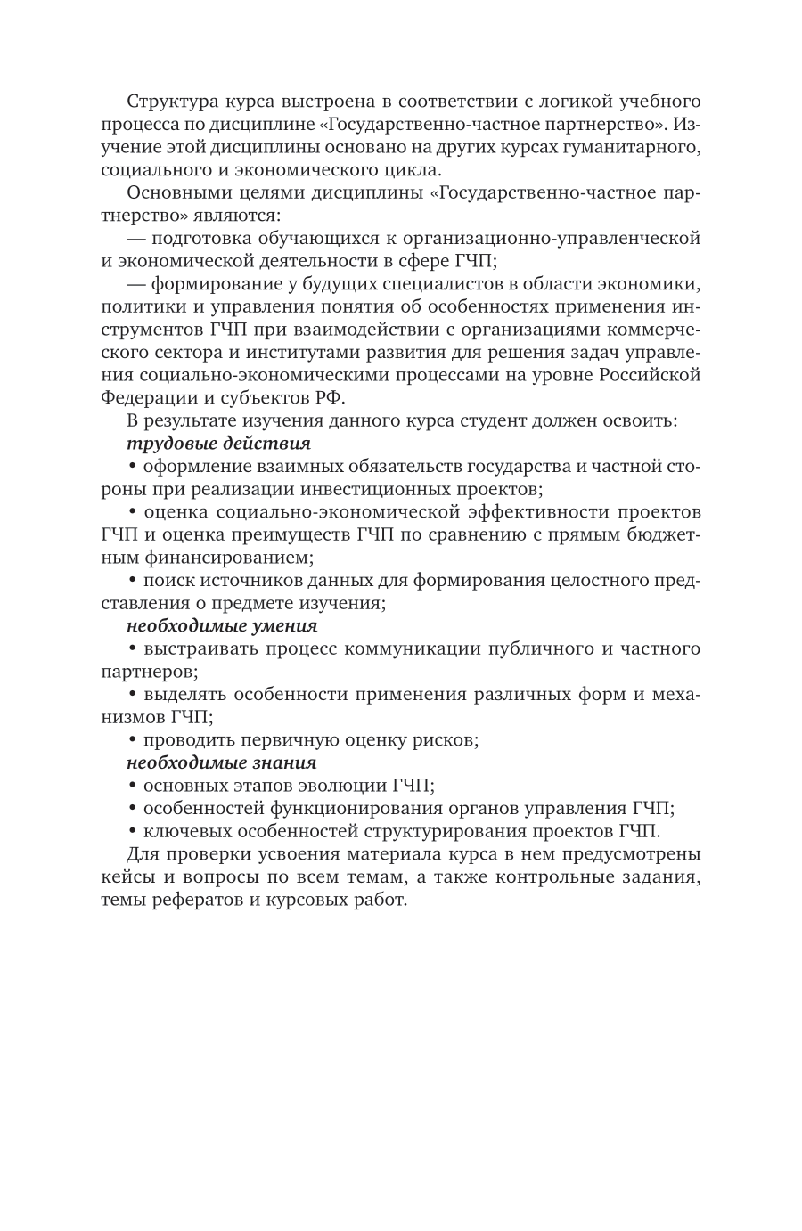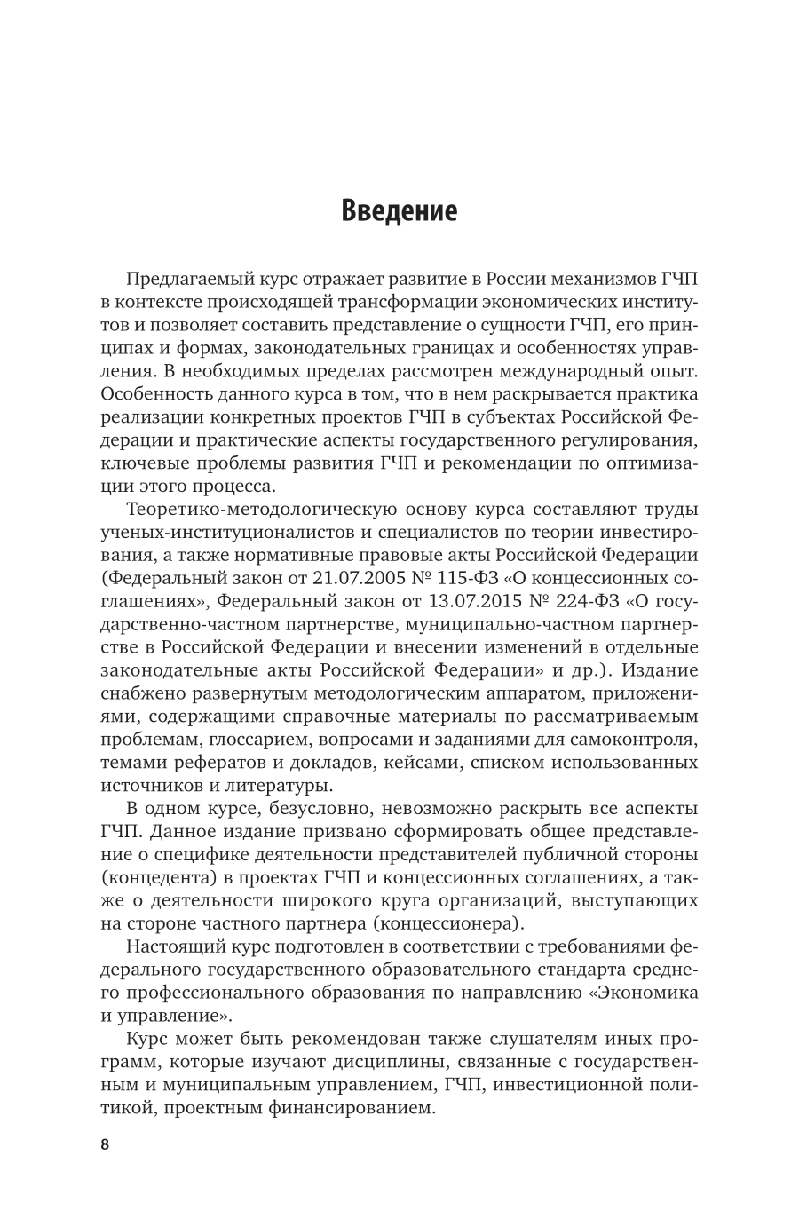 Курс рассказывает о ГЧП, его принципах и формах, законодательных границах и особенностях реализации проектов. В необходимых пределах рассмотрен международный, региональный и отраслевой опыт. Раскрываются процедуры отбора частного партнера, специфика концессионных соглашений, соглашений о ГЧП и договорных форм, близких к ГЧП: контрактов жизненного цикла, инвестиционных соглашений, специальных инвестиционных контрактов и др. Курс содержит кейсы, контрольные вопросы и задания, темы докладов. Материал соответствует актуальным требованиям федерального государственного образовательного стандарта среднего профессионального образования и профессиональным требованиям. Курс адресован студентам образовательных учреждений среднего профессионального образования, а также всем интересующимся современными тенденциями развития экономики и управления.