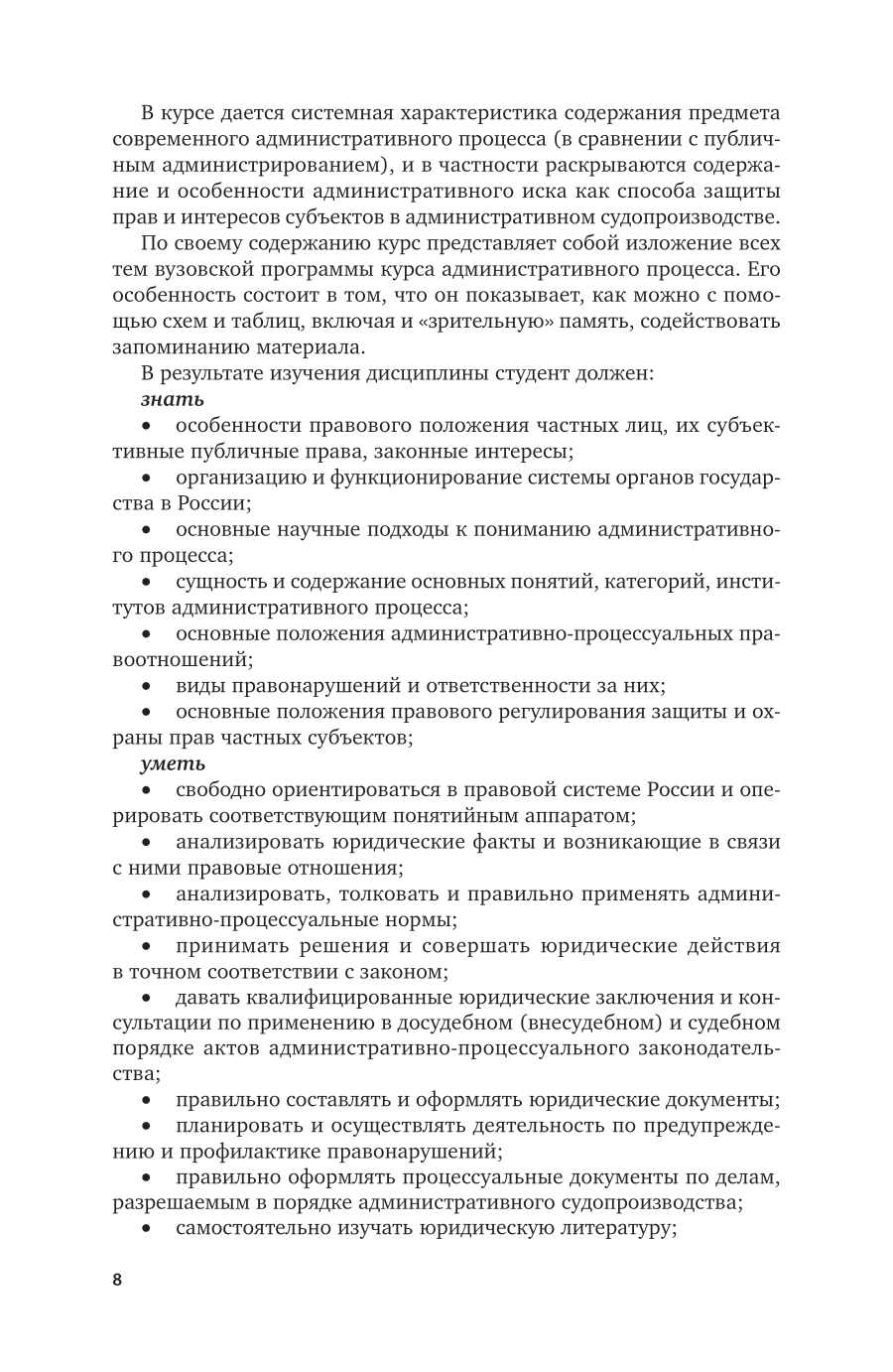 В курсе рассматриваются понятие, принципы, источники, система и основные институты административно-процессуального права как комплекса норм, регулирующих административное судопроизводство. Раскрыты вопросы разрешения дел из административных и иных публичных правоотношений судами общей юрисдикции и арбитражными судами. Наличие схематически изложенного материала дает студентам возможность существенно сократить время на подготовку и яснее видеть суть материала, проявить определенную самостоятельность в его изучении. Соответствует актуальным требованиям федерального государственного образовательного стандарта высшего образования. Курс предназначен для студентов юридических направлений и специальностей.