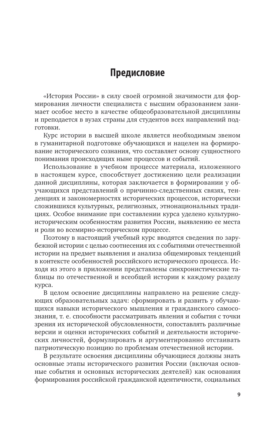В курсе представлено лаконичное изложение всей истории России с древних времен и до наших дней. В результате обучения студенты будут иметь комплексное представление о культурно-историческом развитии России, ее месте в мировой цивилизации; знать основные закономерности и особенности всемирно-исторического процесса с акцентом на изучение истории России; исторические проблемы, связанные с областью будущей профессиональной деятельности; иметь навыки получения, анализа и обобщения исторической информации. Многочисленные схемы и таблицы, которыми сопровождается текст, помогут более наглядно представить особенности исторических периодов, внешней и внутренней политики России на разных этапах истории, наиболее значимых событий. Контрольные вопросы позволят проверить степень усвоения теоретического материала. Соответствует актуальным требованиям федерального государственного образовательного стандарта высшего образования. Для студентов высших учебных заведений, обучающихся по инженерно-техническим и естественно-научным направлениям.