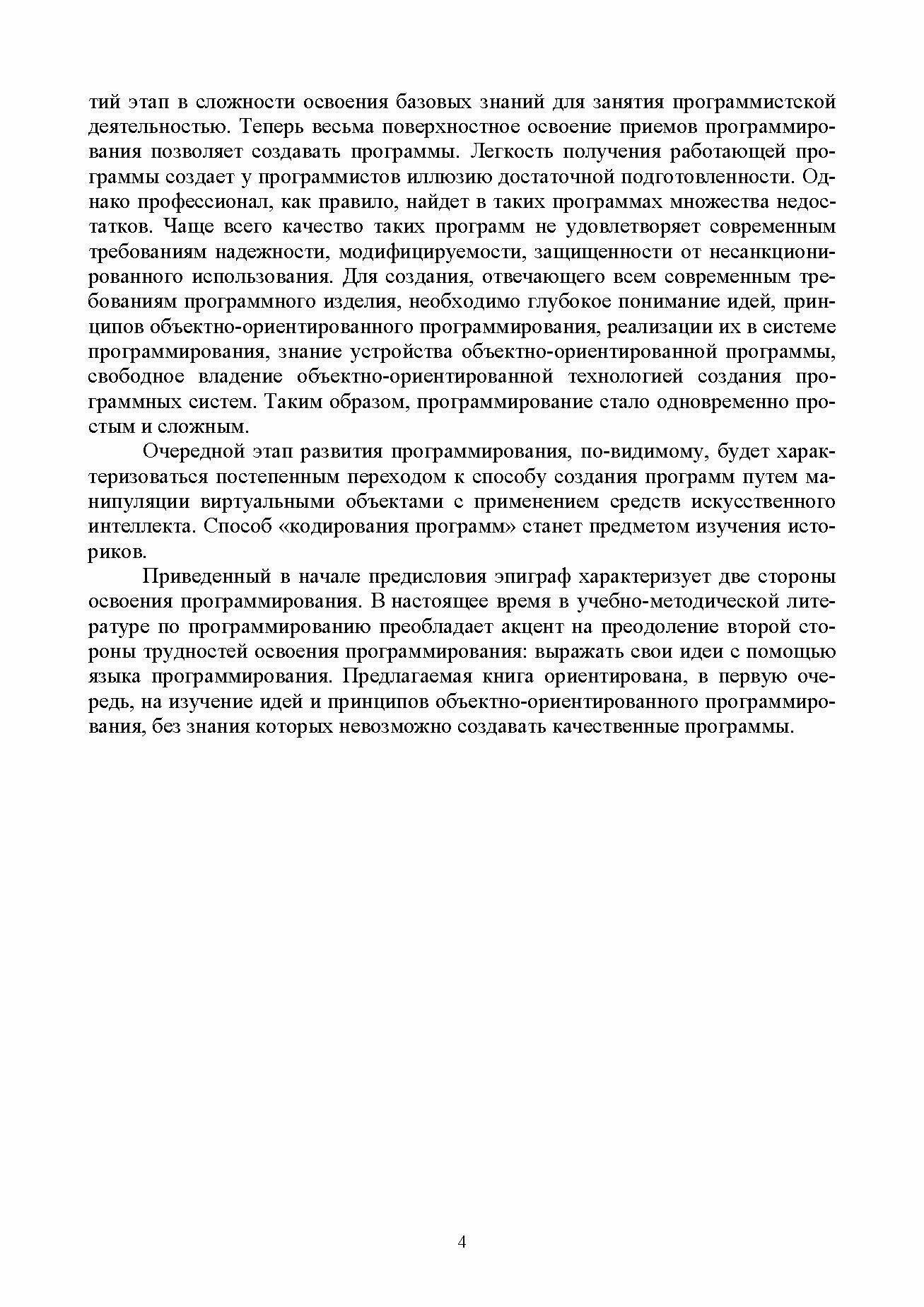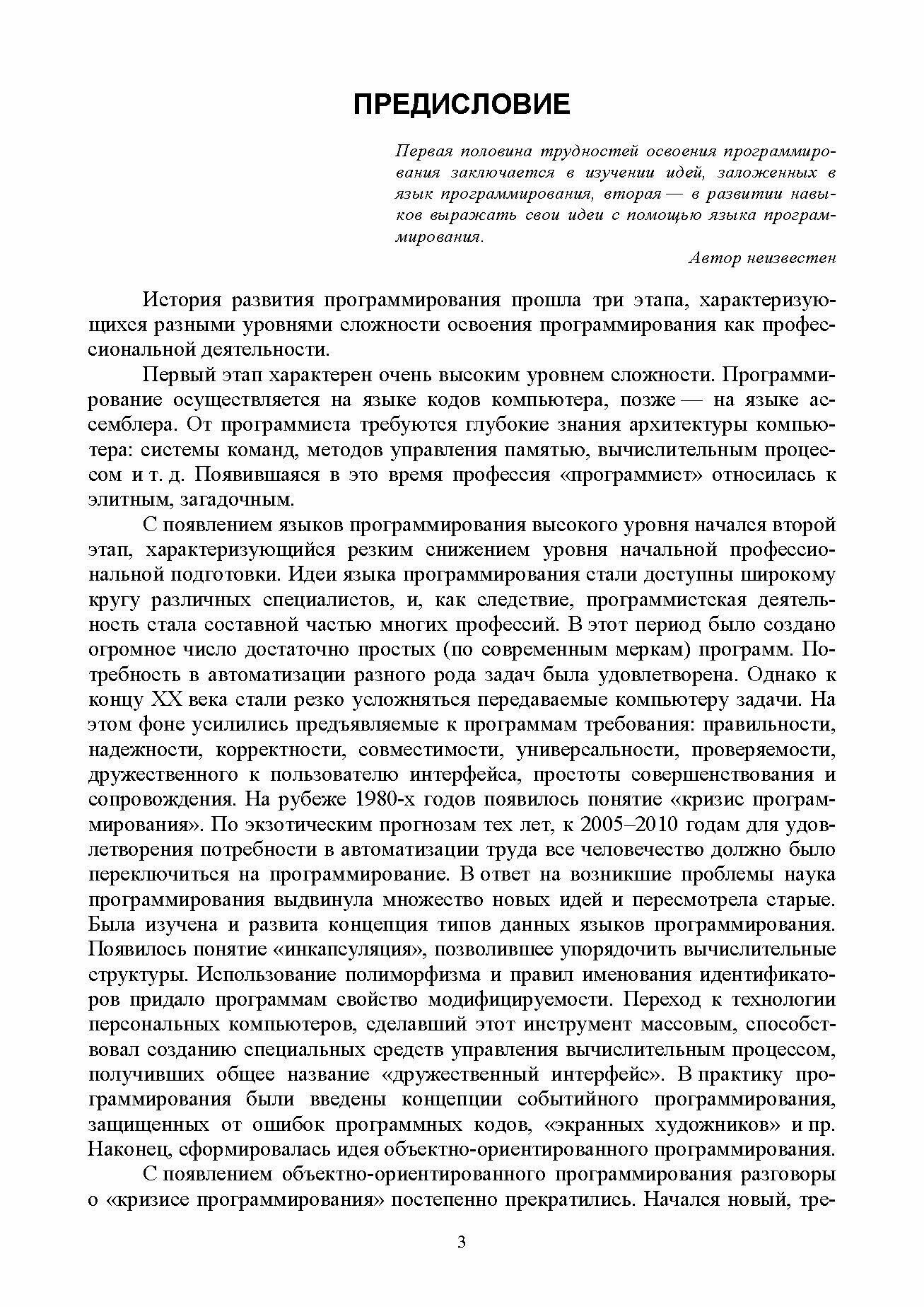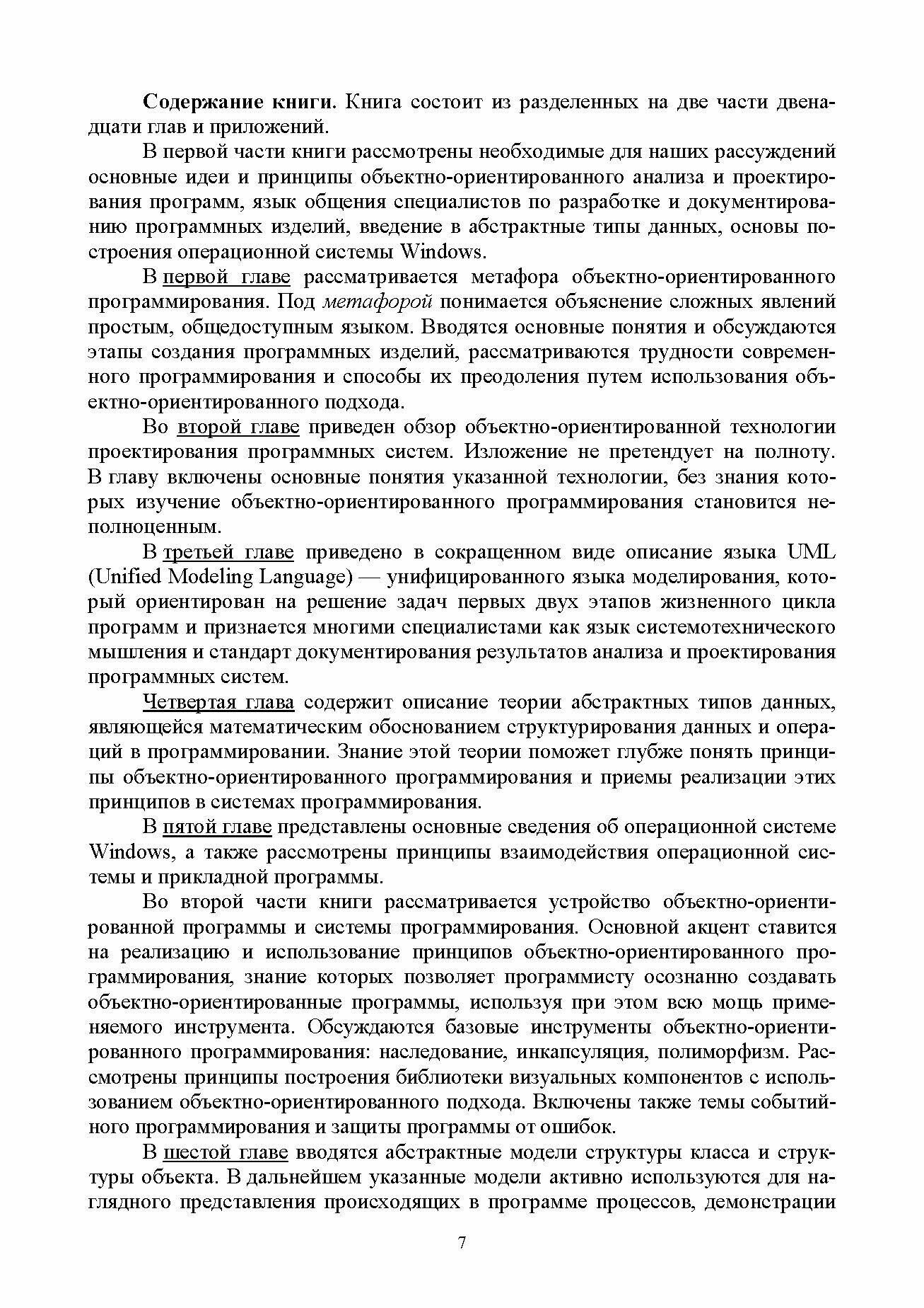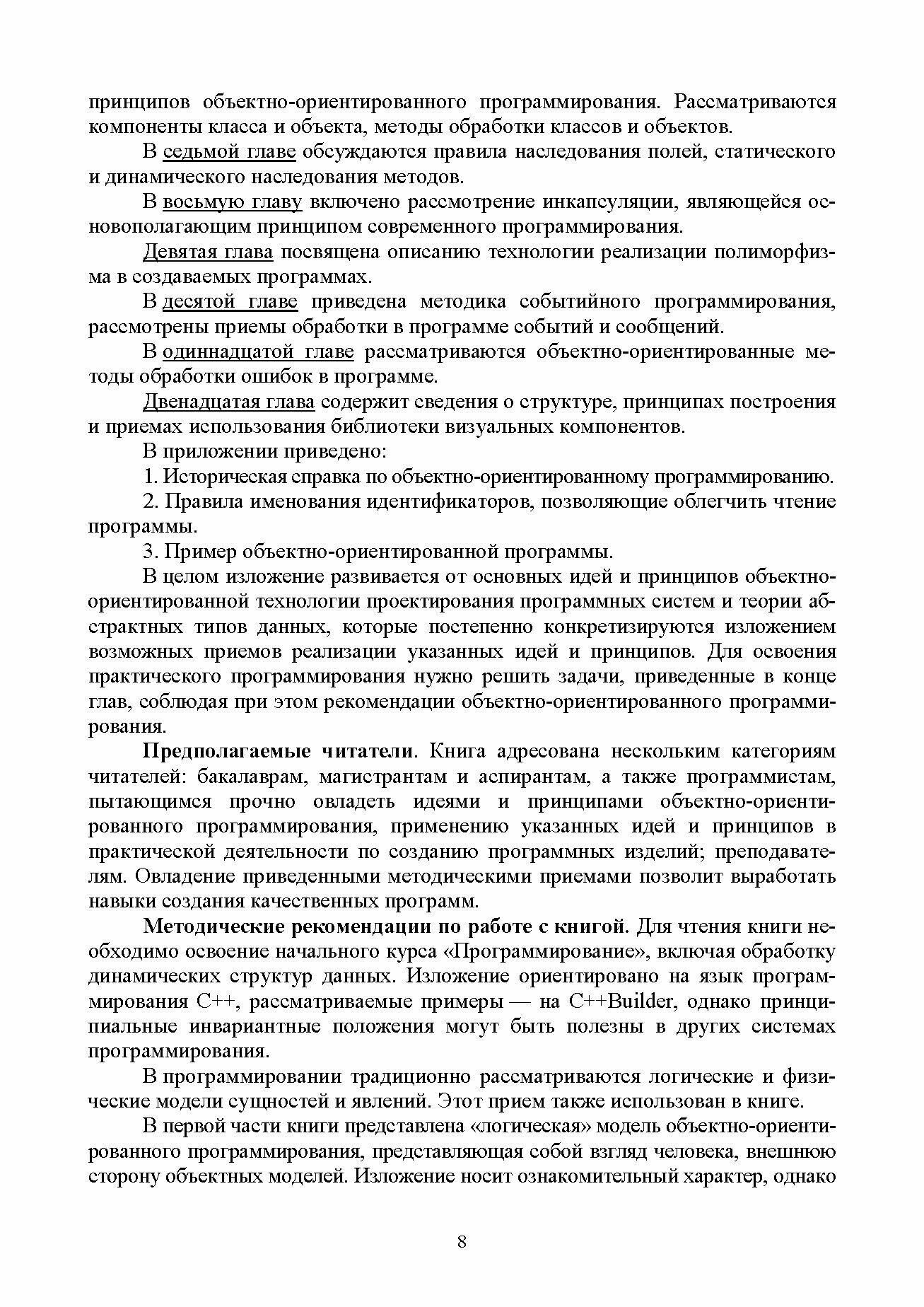 Является учебником по одноименной дисциплине. В первой части кратко рассмотрены: природа классов и объектов, объектно-ориентированный анализ и проектирование программных систем, взаимодействие с операционной системой Windows, абстрактные типы данных. Во второй части подробно обсуждаются базовые основы объектно-ориентированного программирования: наследование, инкапсуляция, полиморфизм, событийное взаимодействие. Графические модели структур классов и структур объектов используются для наглядного представления принципов объектно-ориентированного программирования, что позволяет глубже понять происходящие в объектно-ориентированной программе процессы. Изложение сопровождается программными примерами с использованием инструментальной среды программирования RAD Studio и языка С++Builder. Принципиальные инвариантные положения могут быть полезны при изучении других языков и систем программирования. Учебник предназначен для преподавателей, студентов, магистрантов, аспирантов, программистов.