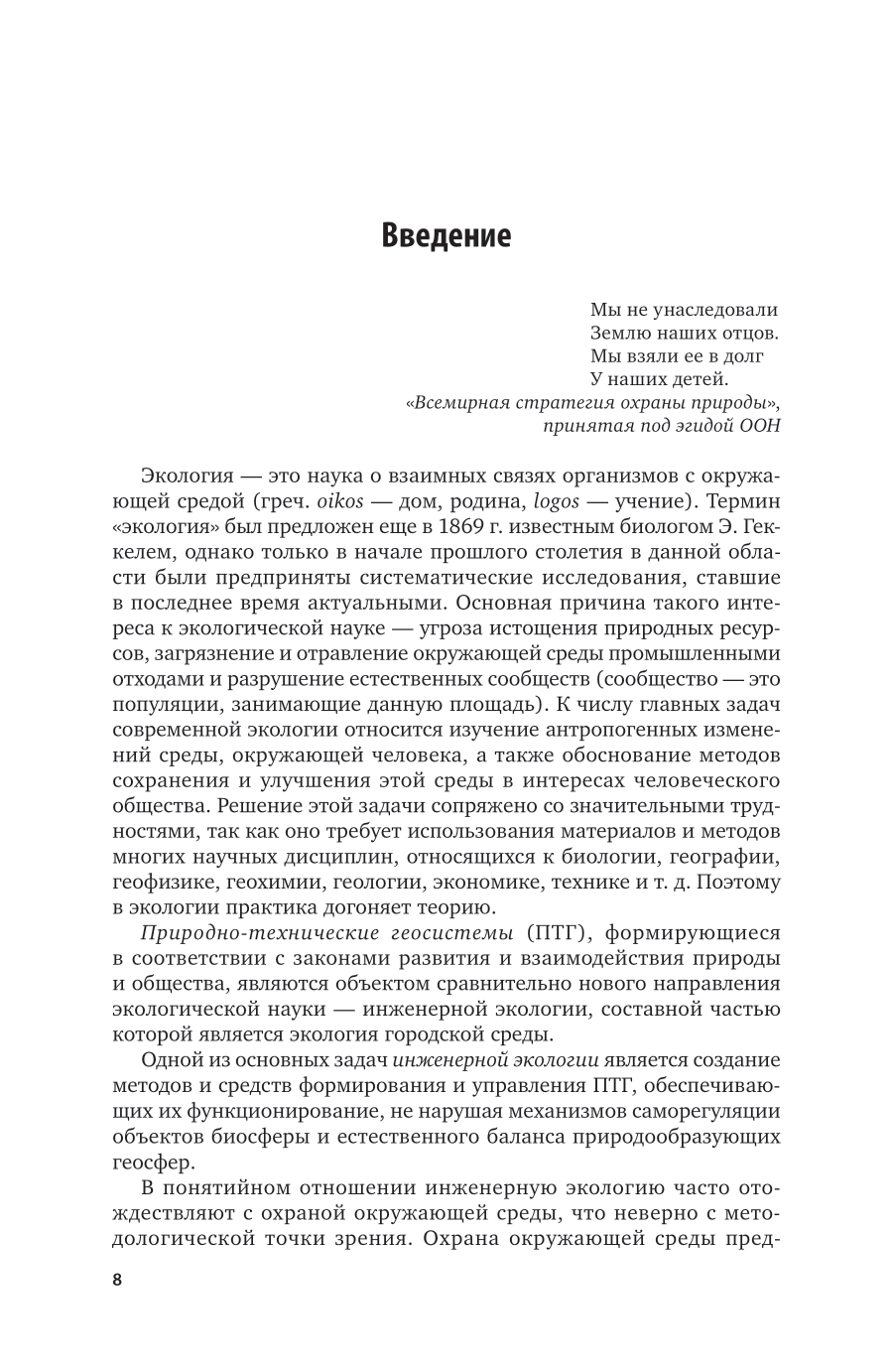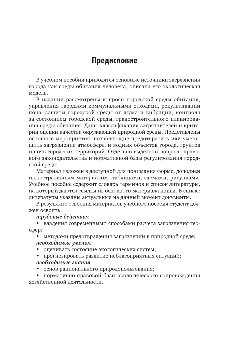 В учебном пособии приведены основные источники загрязнения города как среды обитания человека, описана его экологическая модель. Даны классификация загрязнителей и критерии оценки качества окружающей природной среды. Представлены основные мероприятия, позволяющие предотвратить или уменьшить загрязнение атмосферы и водных объектов города, грунтов и почв городских территорий. Рассмотрены вопросы правового законодательства и нормативной базы регулирования городской среды, мониторинга состояния атмосферы, управления твердыми бытовыми отходами. Соответствует актуальным требованиям Федерального государственного образовательного стандарта среднего профессионального образования и профессиональным требованиям. Для студентов образовательных учреждений среднего профессионального образования, обучающихся по направлению «Строительство».