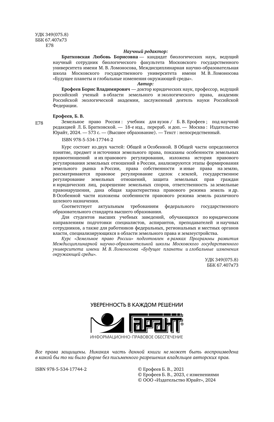 Земельное право России 18-е изд. пер. и доп. Учебник для вузов (Борис Владимирович Ерофеев); ЮРАЙТ, 2023