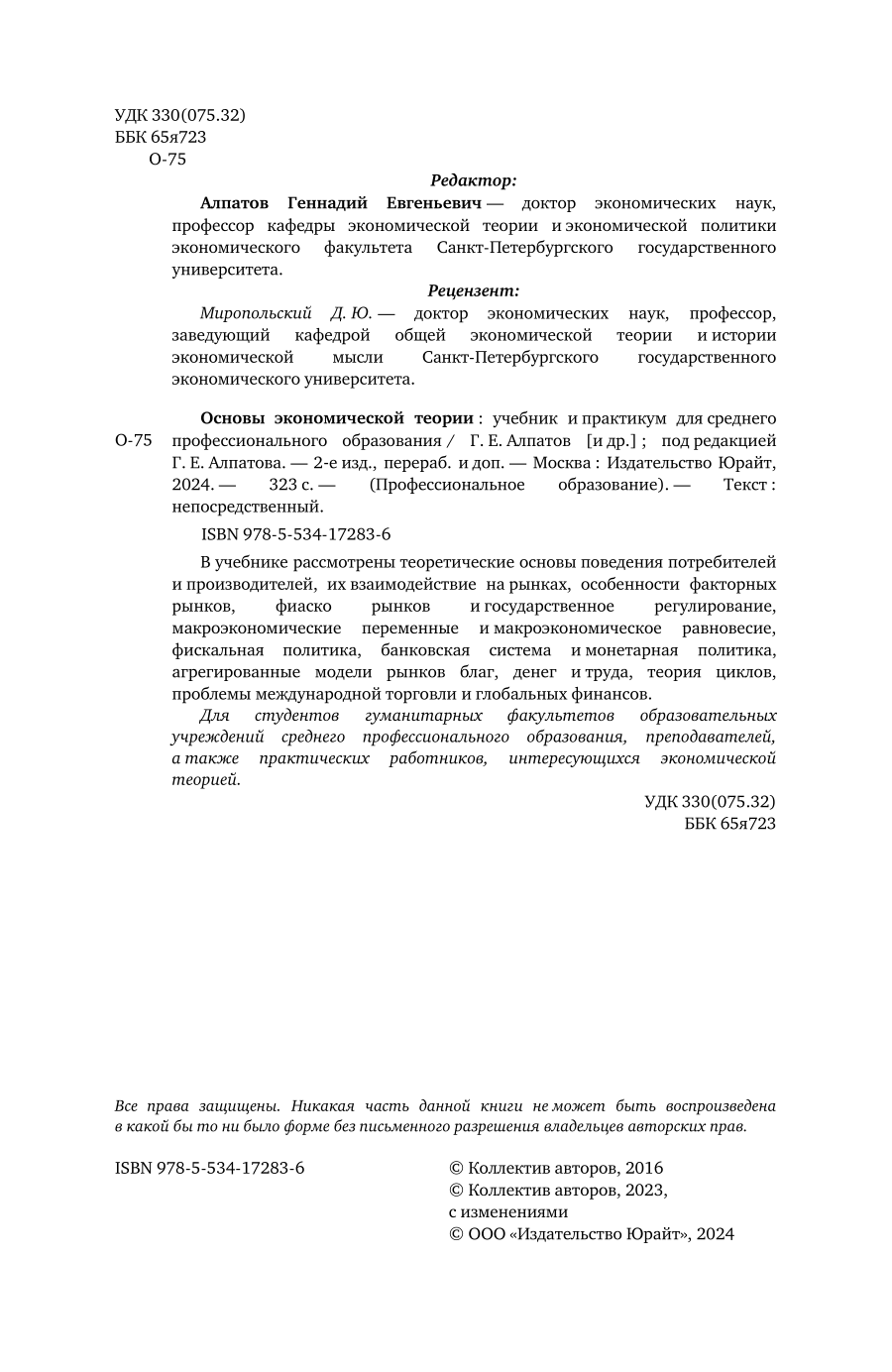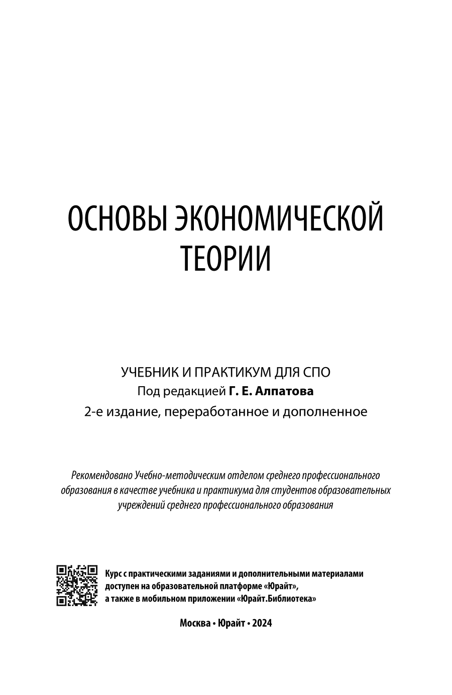 Основы экономической теории для неэкономистов 2-е изд. пер. и доп. Учебник и практикум для СПО (Геннадий Евгеньевич Алпатов); ЮРАЙТ, 2023