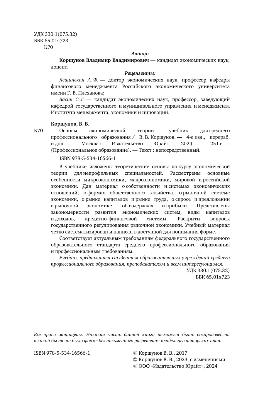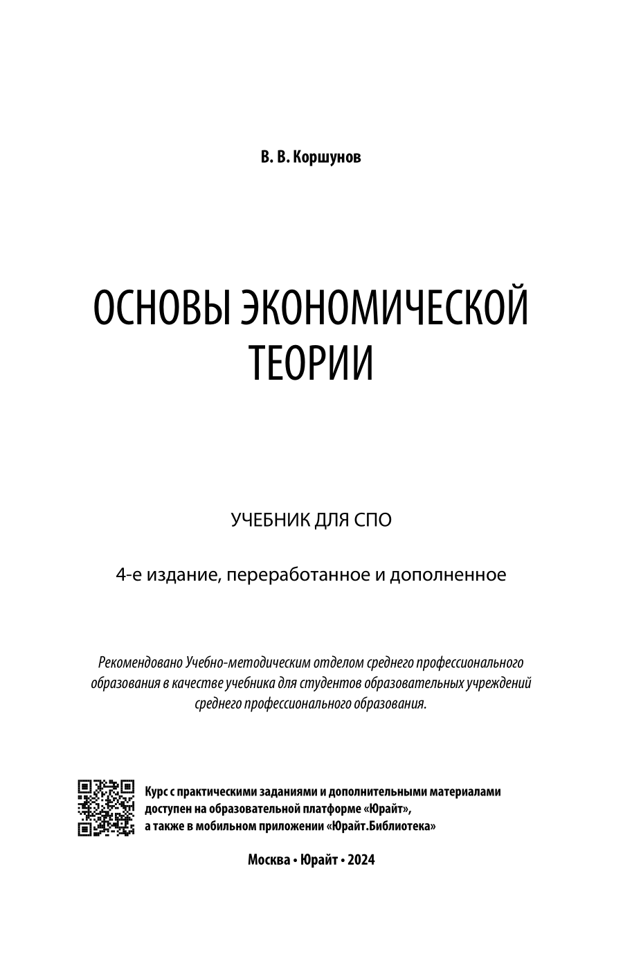 Основы экономической теории 4-е изд. пер. и доп. Учебник для СПО (Владимир Владимирович Коршунов); ЮРАЙТ, 2023