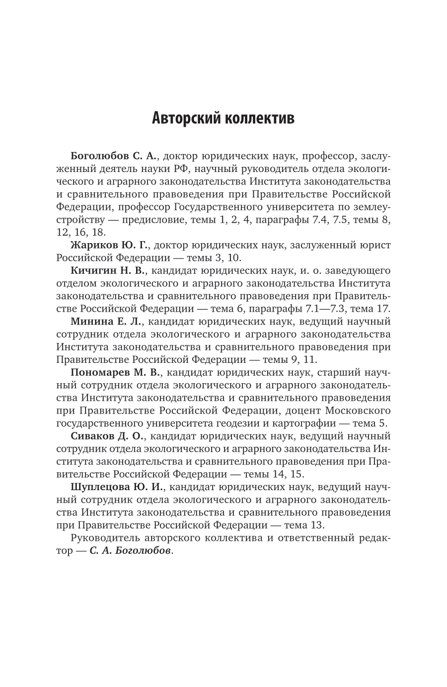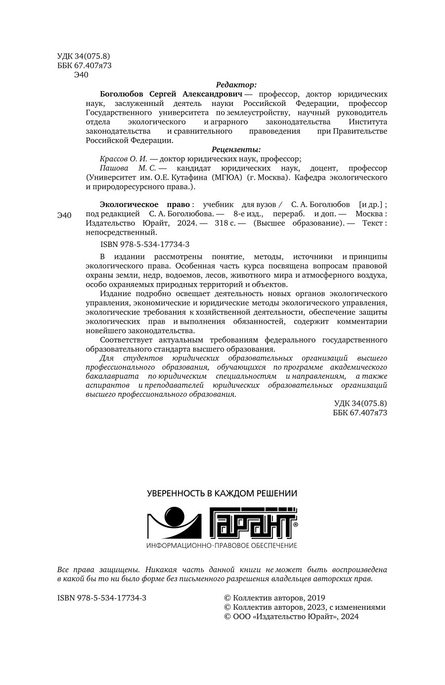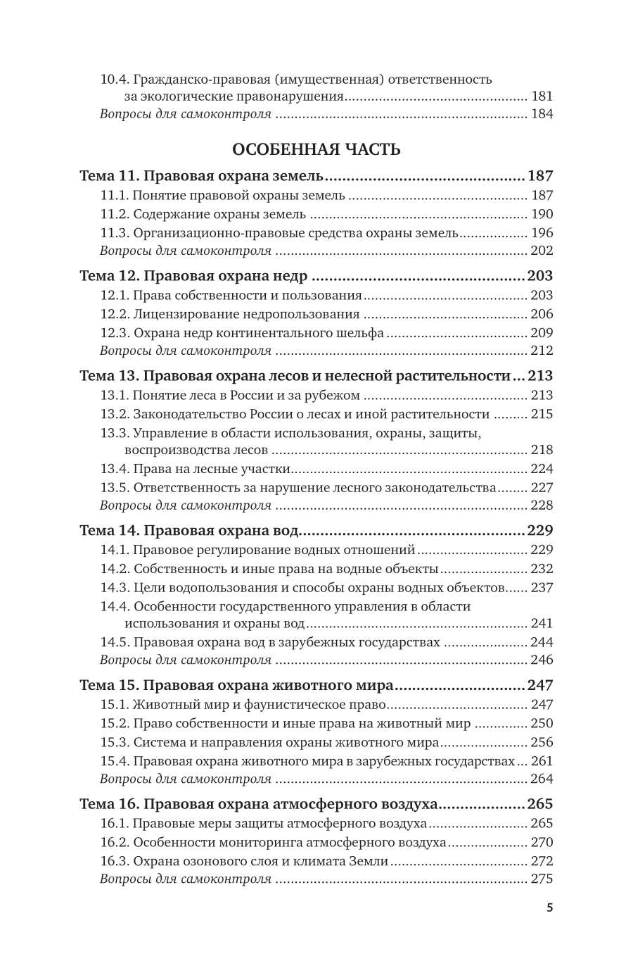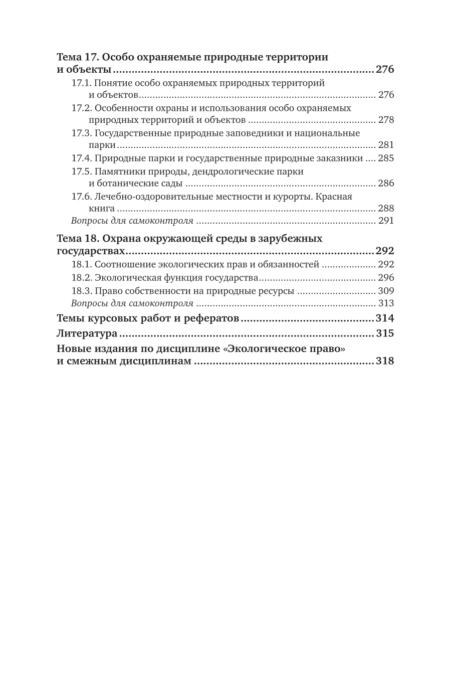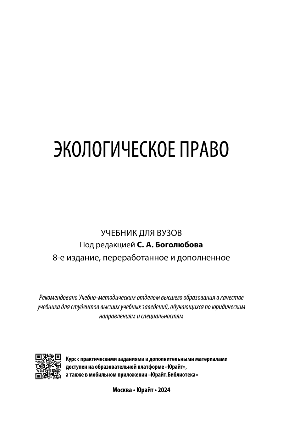 В издании рассмотрены понятие, методы, источники и принципы экологического права. Особенная часть курса посвящена вопросам правовой охраны земли, недр, водоемов, лесов, животного мира и атмосферного воздуха, особо охраняемых природных территорий и объектов. Издание подробно освещает деятельность новых органов экологического управления, экономические и юридические методы экологического управления, экологические требования к хозяйственной деятельности, обеспечение защиты экологических прав и выполнения обязанностей, содержит комментарии новейшего законодательства. Соответствует актуальным требованиям федерального государственного образовательного стандарта высшего образования. Для студентов юридических образовательных организаций высшего профессионального образования, обучающихся по программе академического бакалавриата по юридическим специальностям и направлениям, а также аспирантов и преподавателей юридических образовательных организаций высшего профессионального образования.