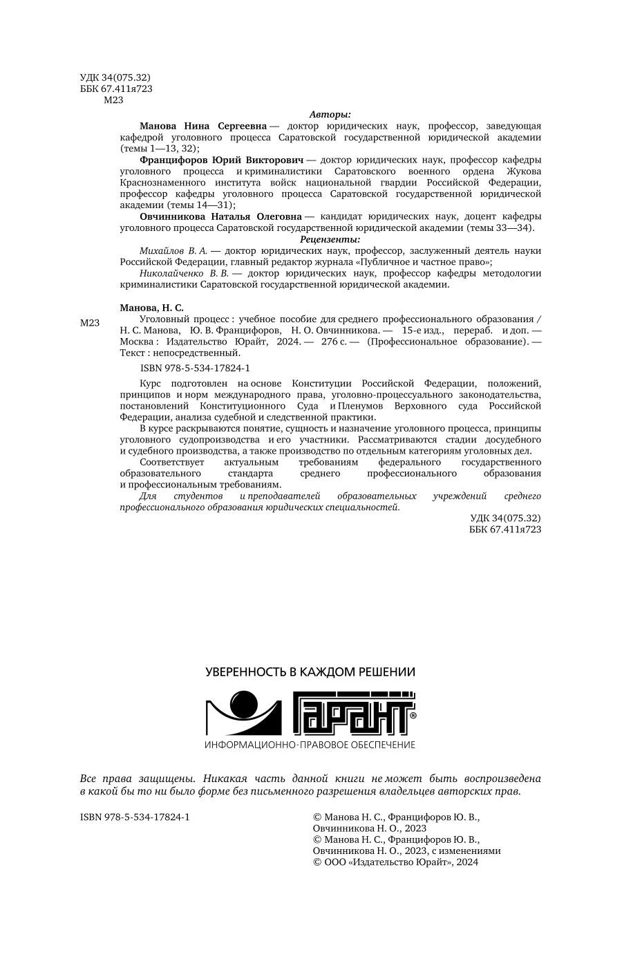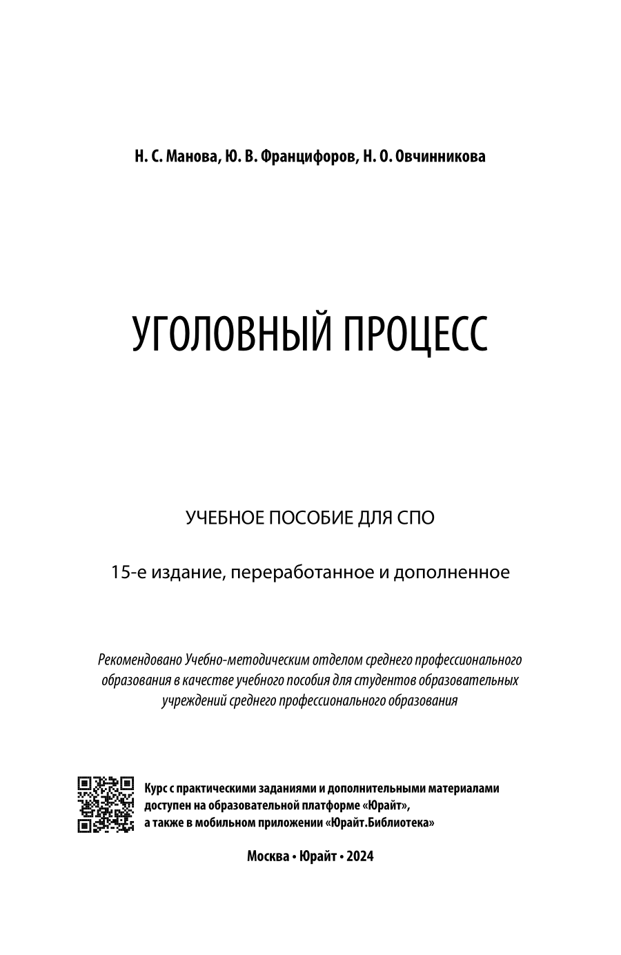 Уголовный процесс 15-е изд. пер. и доп. Учебное пособие для СПО (Юрий Викторович Францифоров); ЮРАЙТ, 2023