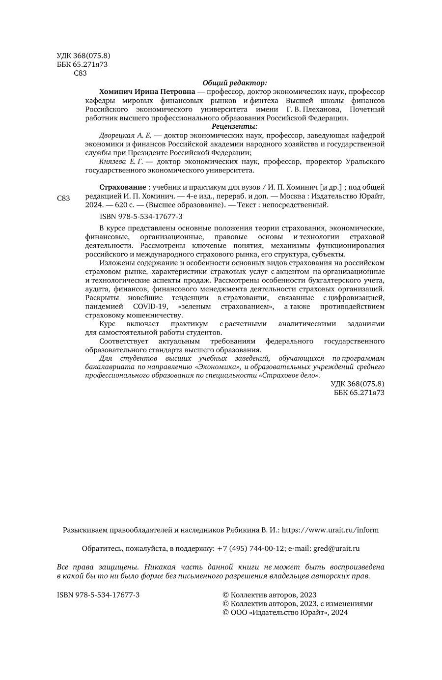 Страхование 4-е изд. пер. и доп. Учебник и практикум для вузов (Хоминич Ирина Петровна; Архангельская Татьяна Алексеевна; Архипов Александр; Асяева Эльмира Ахметшаевна; Ахвледиани Юлия Тамбиевна; Бакланова Лилия Дмитриевна; Дик Елена Владимировна; Козлов Павел Алексеевич; Мягкова Юлия Юрьевна; Рябикин Вадим Иванович; Саввина Оксана Владимировна; Трифонов Борис Игоревич; Финогенова Юлия Юрьевна; Хабаров Александр Аркадьевич; Челухина Наталья Федоровна), 2024