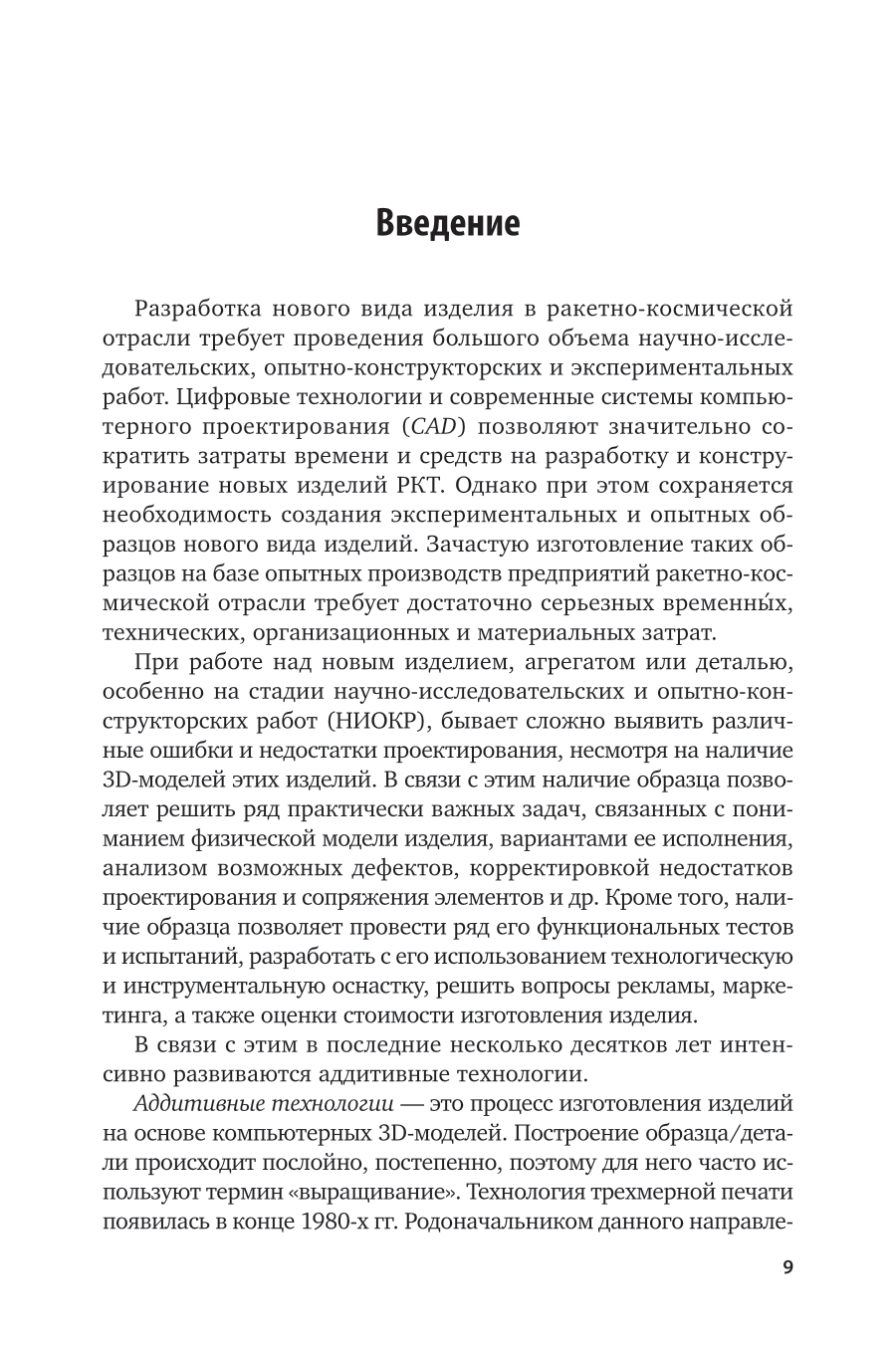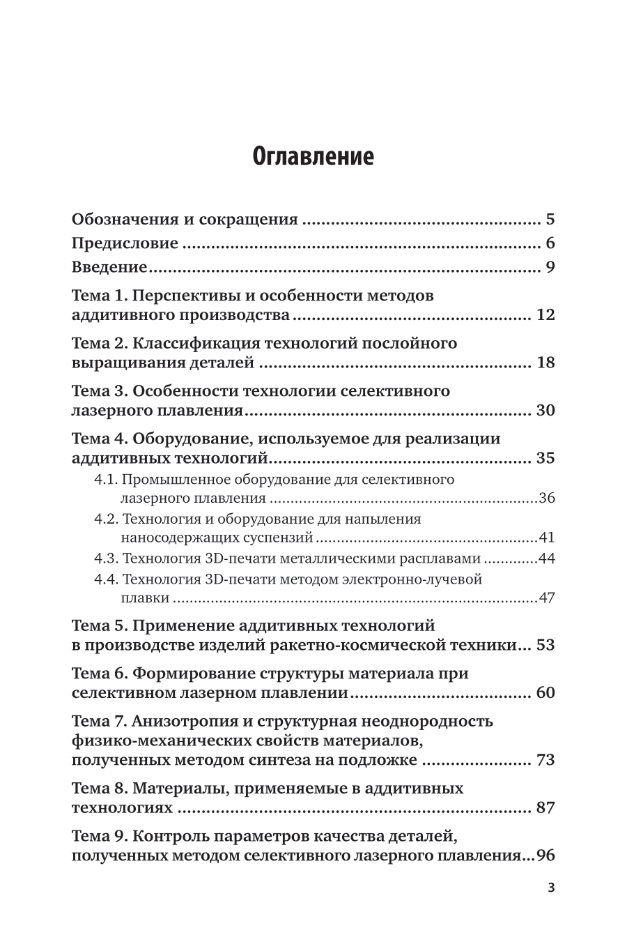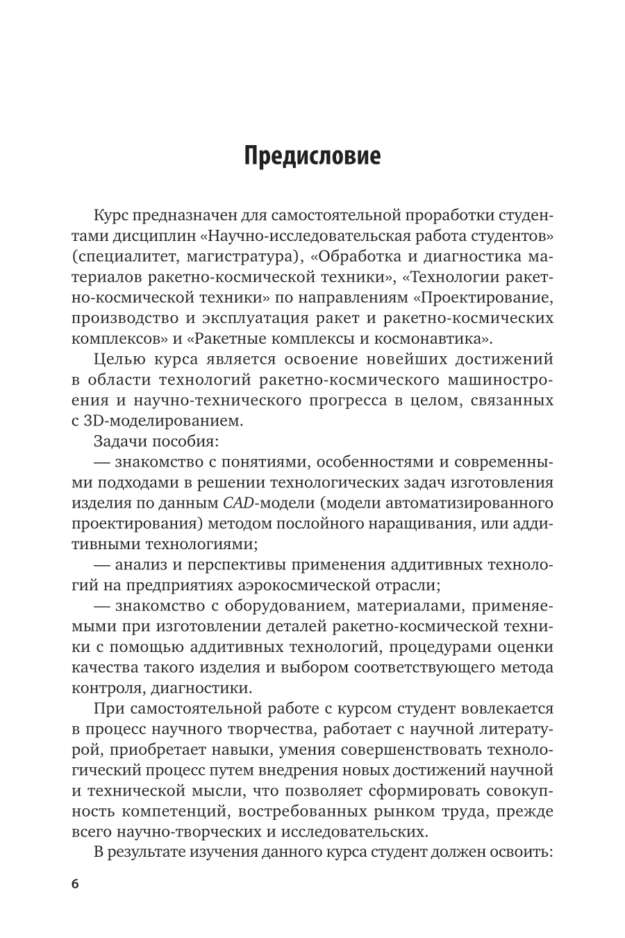 В курсе рассмотрена классификация аддитивных технологий по стандартам ASTM. Описаны характерные особенности технологии селективного лазерного сплавления (СЛС) полимерных порошков. Рассмотрены перспективы развития аддитивных технологий в производстве изделий ракетно-космической техники, а также новые методы оценки анизотропии свойств материалов, полученных методом селективного лазерного плавления. Самостоятельная работа студентов позволит сформировать у них навыки и умения творчески использовать в практической деятельности новейшие достижения в области технологий ракетно-космического машиностроения и научно-технического прогресса в целом. Курс подготовлено в рамках работ, выполняемых по гранту Президента Российской Федерации для государственной поддержки ведущих научных школ (НШ-3778.2018.8) и гранта РФФИ 18-29-18081. Соответствует актуальным требованиям Федерального государственного образовательного стандарта среднего профессионального образования. Для студентов и аспирантов технических специальностей.