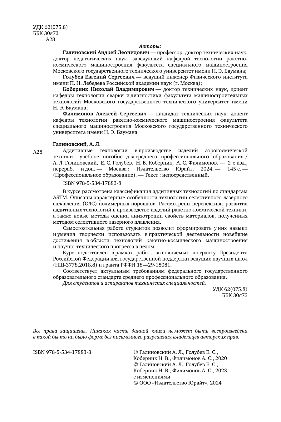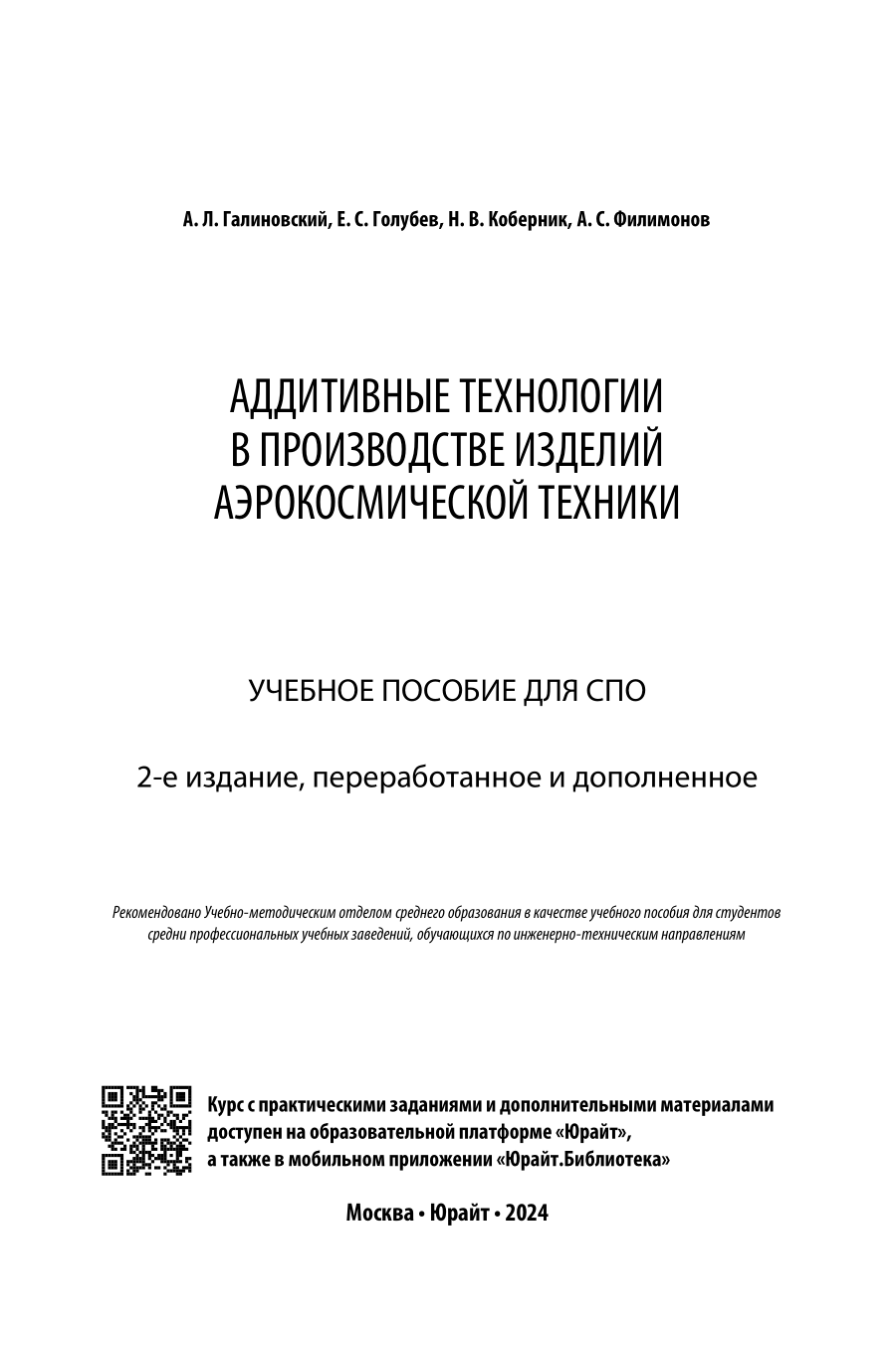 Аддитивные технологии в производстве изделий аэрокосмической техники 2-е изд. пер. и доп. Учебное пособие для СПО (Алексей Сергеевич Филимонов); ЮРАЙТ, 2023