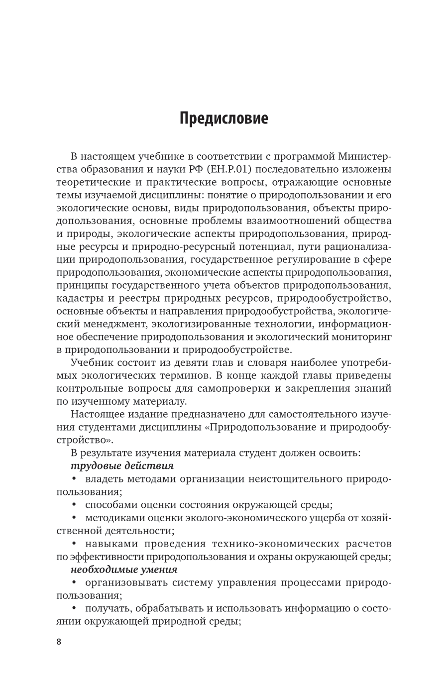 Учебник представляет собой комплекс знаний в области природопользования, охраны окружающей среды, общей экологии и экологического права. Рассматриваются теоретические аспекты взаимоотношений организмов с окружающей средой, вопросы организации и функционирования естественных экосистем и техноценозов, структура и устойчивость биосферы, основные положения по регулированию отношений природы и общества. Изложены вопросы оценки и прогнозирования состояния окружающей среды. В конце каждой главы приведены контрольные вопросы для самопроверки и закрепления знаний по изученному материалу.