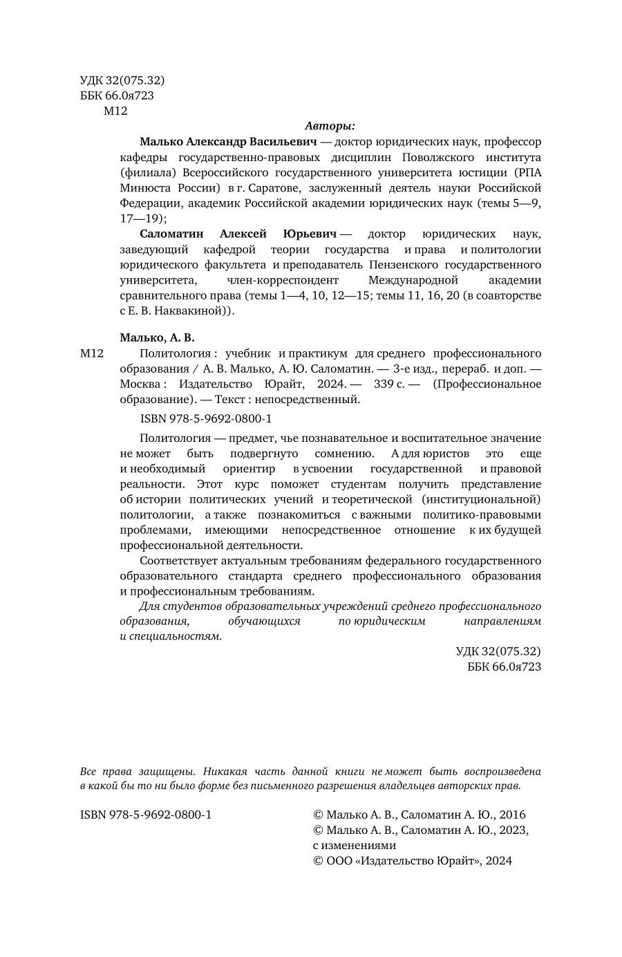 Политология - предмет, чье познавательное и воспитательное значение не может быть подвергнуто сомнению. А для юристов это еще и необходимый ориентир в усвоении государственной и правовой реальности. Этот курс поможет студентам получить представление об истории политических учений и теоретической (институциональной) политологии, а также познакомиться с важными политико-правовыми проблемами, имеющими непосредственное отношение к их будущей профессиональной деятельности. Соответствует актуальным требованиям федерального государственного образовательного стандарта среднего профессионального образования и профессиональным требованиям. Для студентов образовательных учреждений среднего профессионального образования, обучающихся по юридическим направлениям и специальностям.