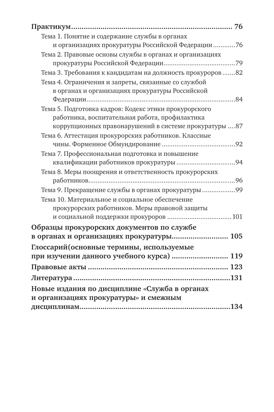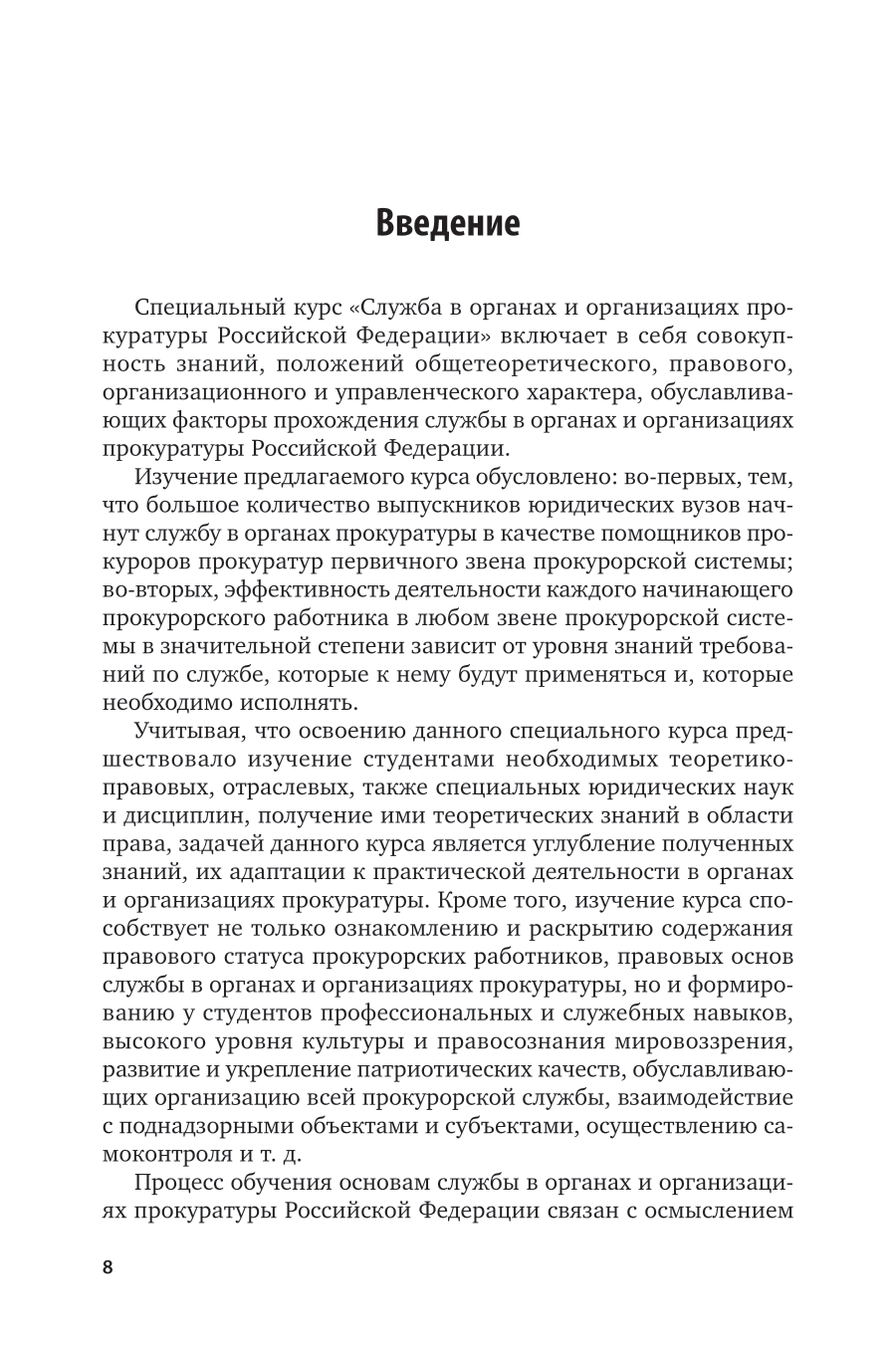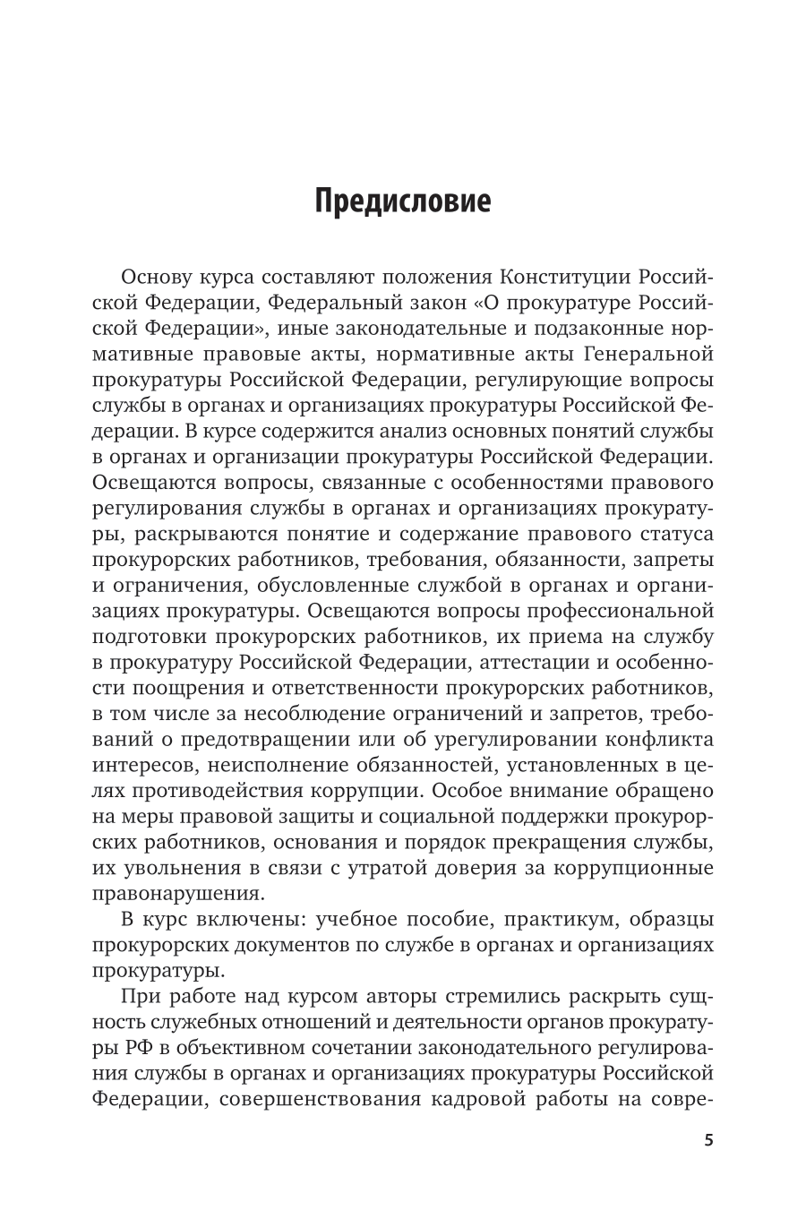 Настоящий курс изготовлен на основании действующего федерального законодательства, требований, изложенных в нормативных актах Генеральной прокуратуры Российской Федерации, а также с учетом практики службы прокурорских работников в системе прокуратуры Российской Федерации. В курсе раскрываются понятие, содержание и правовые основы службы в органах и организациях прокуратуры. Излагаются и анализируются требования к кандидатам на должности прокуроров, ограничения, запреты и обязанности, связанные со службой в органах и организациях прокуратуры Российской Федерации. Характеризуется специфика подготовки кадров, повышения квалификации прокурорских работников. Рассматриваются особенности мер поощрения и ответственности (в том числе, административной и уголовной), материального и социального обеспечения, правовой защиты и социальной поддержки прокурорских работников, а также особенности прекращения их службы в органах и организациях прокуратуры. Соответствует актуальным требованиям Федерального государственного образоательного стандарта высшего образования. Данный курс, прежде всего, специализирован для студентов, магистрантов, аспирантов и преподавателей высших юридических учебных организаций. Может быть использован практическими работниками органов прокуратуры, иными лицами, кто интересуется вопросами прохождения службы в органах и организациях прокуратуры Российской Федерации.
