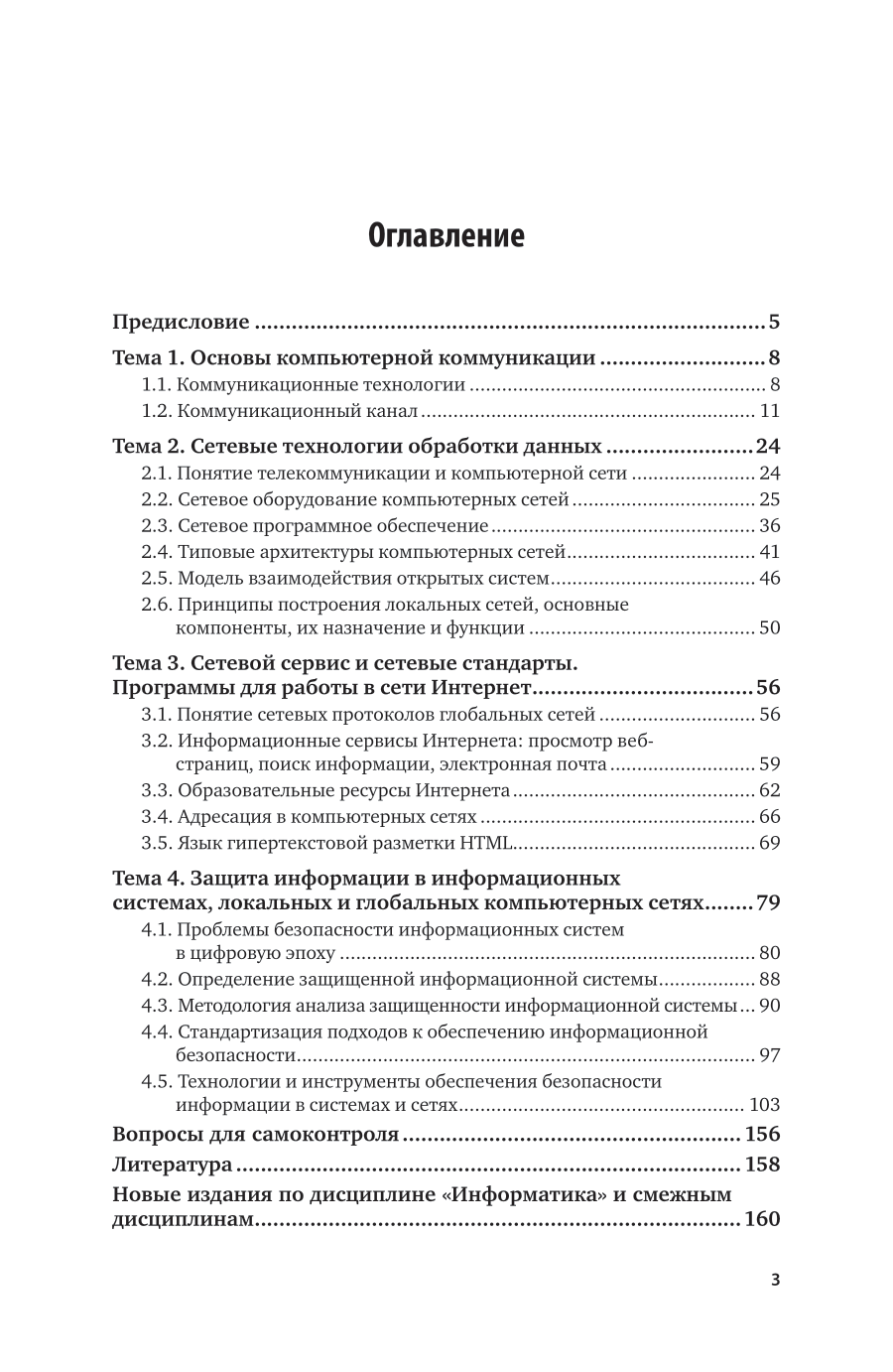 В данном курсе, представляющем собой один из модулей дисциплины «Информатика», рассмотрены основы построения и использования компьютерных сетей, физические основы средств передачи информации, основные понятия сетевых служб глобальных компьютерных сетей, информационные сервисы глобальных сетей, основы построения, расчета и анализа современных системы защиты информации, информационных систем и вычислительных ресурсов на всех уровнях управления современным предприятием, основные международные и российские стандарты в области информационной безопасности. Курс соответствует актуальным требованиям федерального государственного образовательного стандарта высшего образования. Для студентов высших учебных заведений, обучающихся по экономическим направлениям, аспирантов и преподавателей, специалистов организаций любого уровня и сферы хозяйствования.
