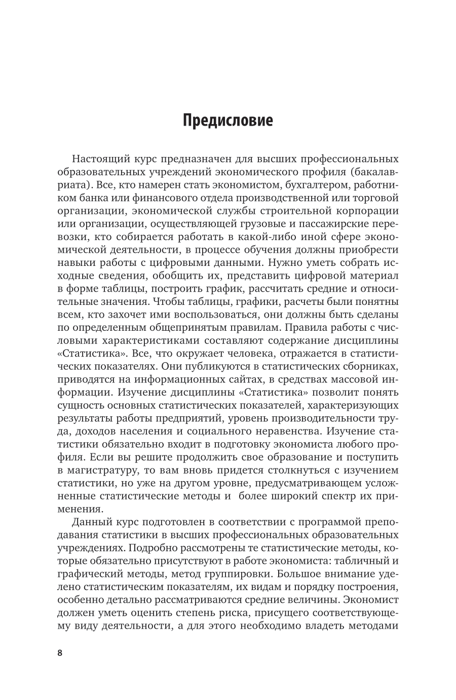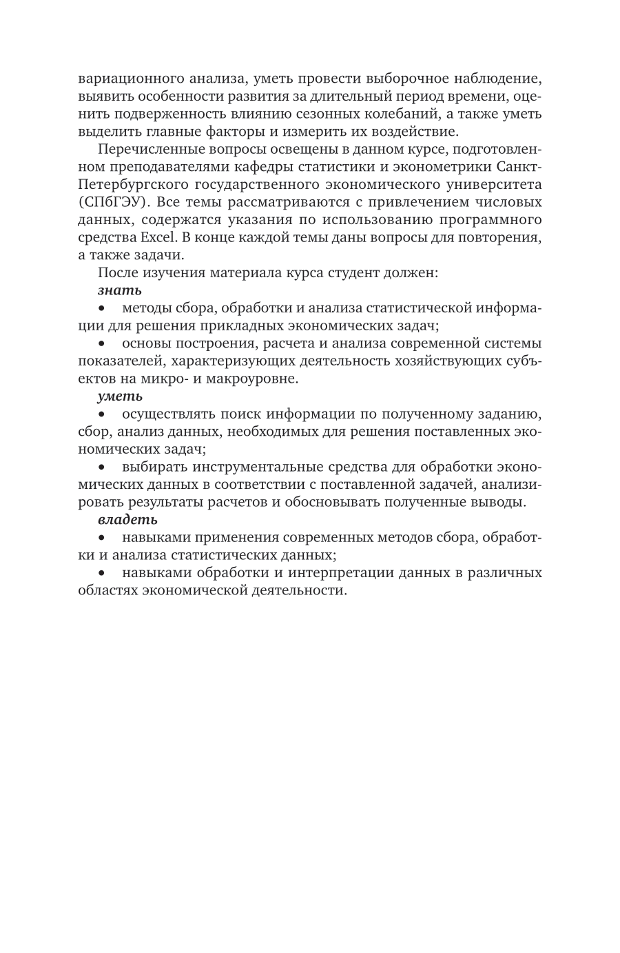 Курс подготовлен преподавателями кафедры статистики и эконометрики Санкт-Петербургского государственного экономического университета. Рассматриваются основные статистические методы, применяемые для сбора, обобщения, представления и анализа массовых данных, относящихся к социальным или экономическим явлениям и процессам. Излагаются основные методы статистического исследования с использованием пакета Microsoft Office Excel. Учтены современные требования развития российской экономики и информационного обеспечения решения социальных проблем. При рассмотрении всех вопросов приводятся многочисленные примеры, что повышает усвоение изучаемого материала. Содержание курса соответствует актуальным требованиям федерального государственного образовательного стандарта высшего образования. Для студентов высших учебных заведений, обучающихся по экономическим направлениям.