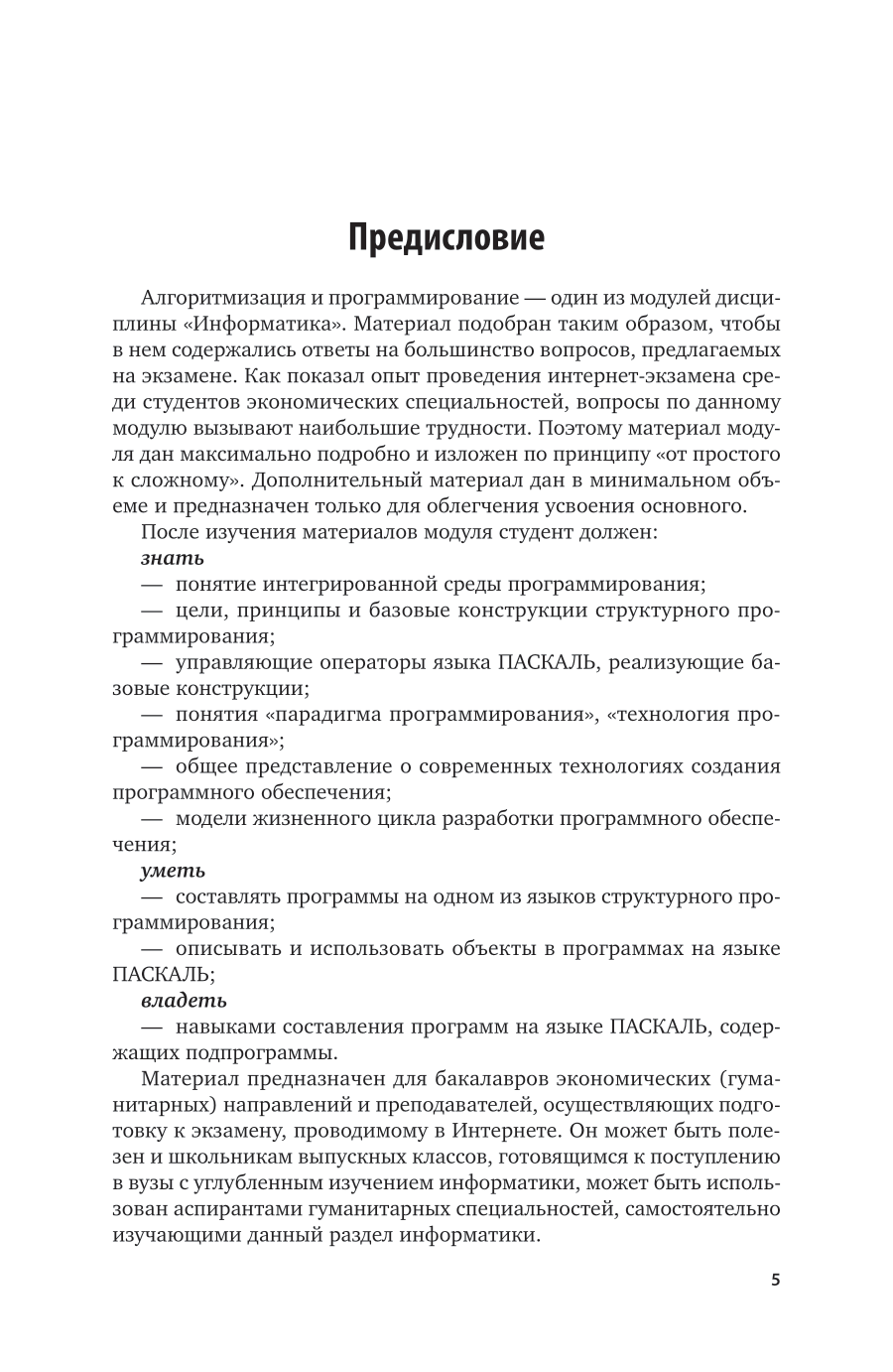 В курсе, представляющем собой один из модулей дисциплины «Информатика», рассмотрены модели решения функциональных и вычислительных задач, алгоритмизация и программирование, языки программирования высокого уровня, технологии программирования. Курс соответствует актуальным требованиям федерального государственного образовательного стандарта высшего образования. Для студентов высших учебных заведений, обучающихся по экономическим направлениям, аспирантов и преподавателей, специалистов организаций любого уровня и сферы хозяйствования.