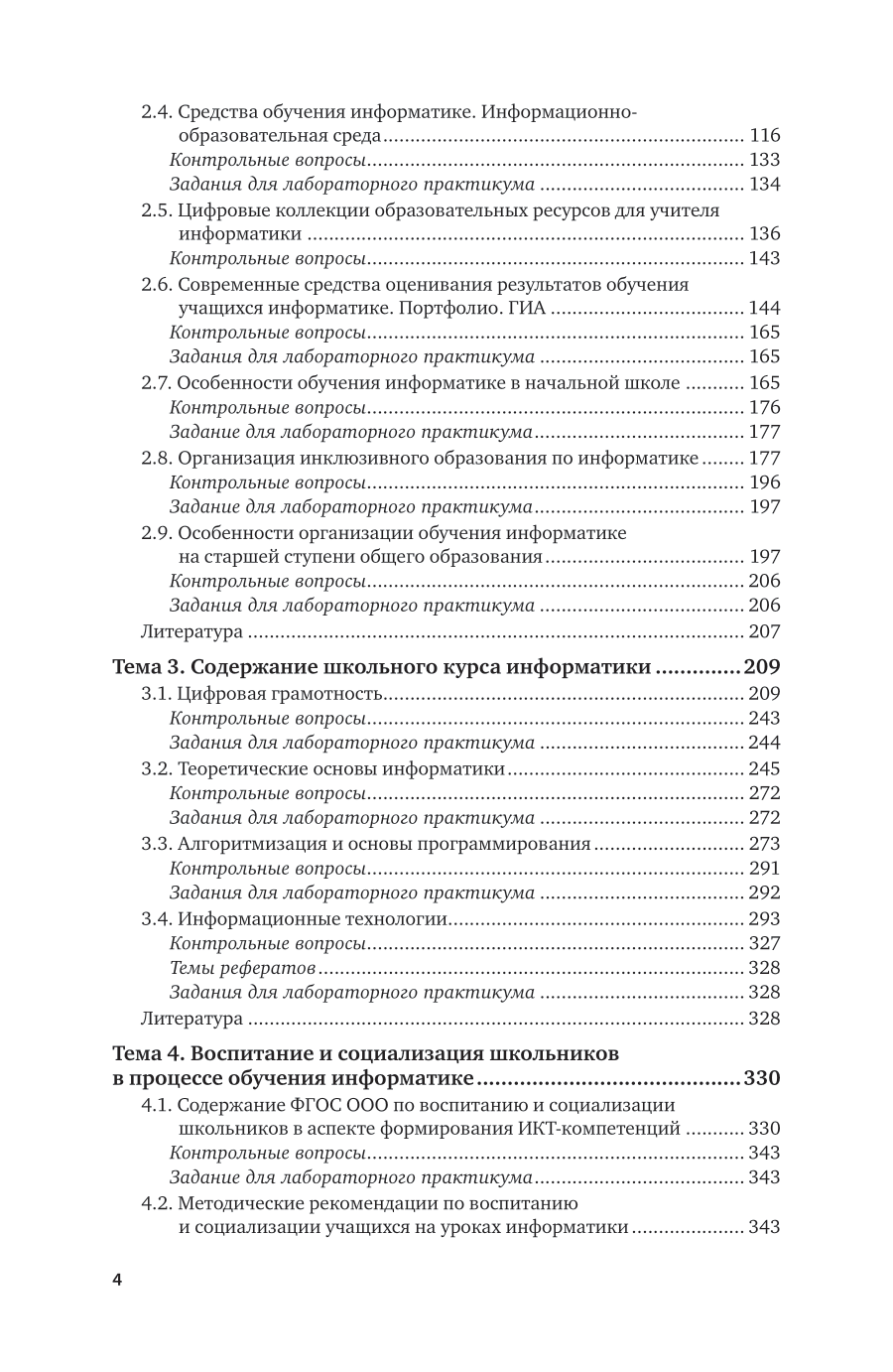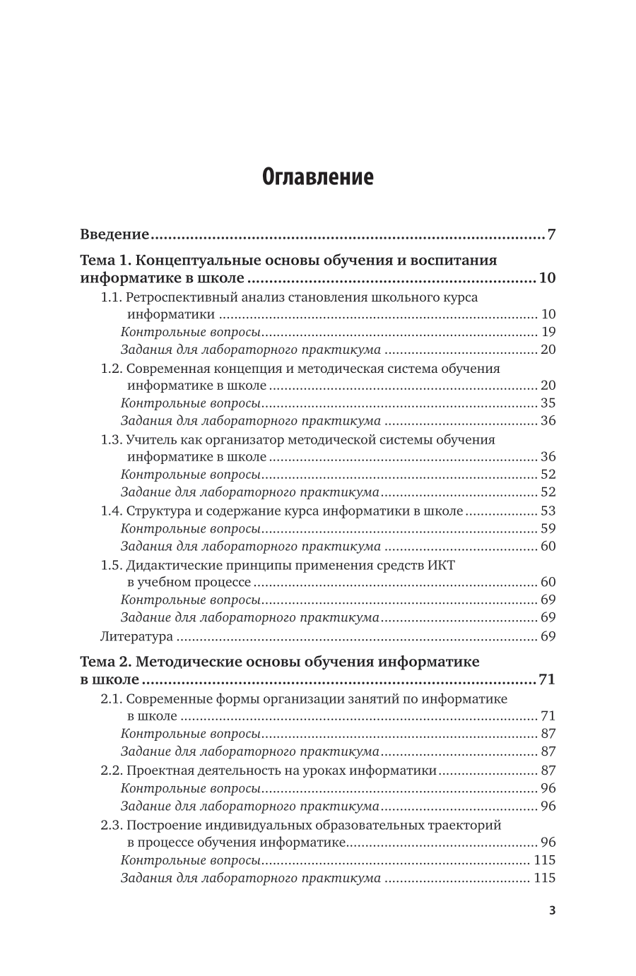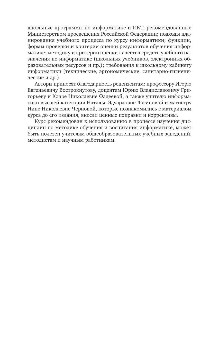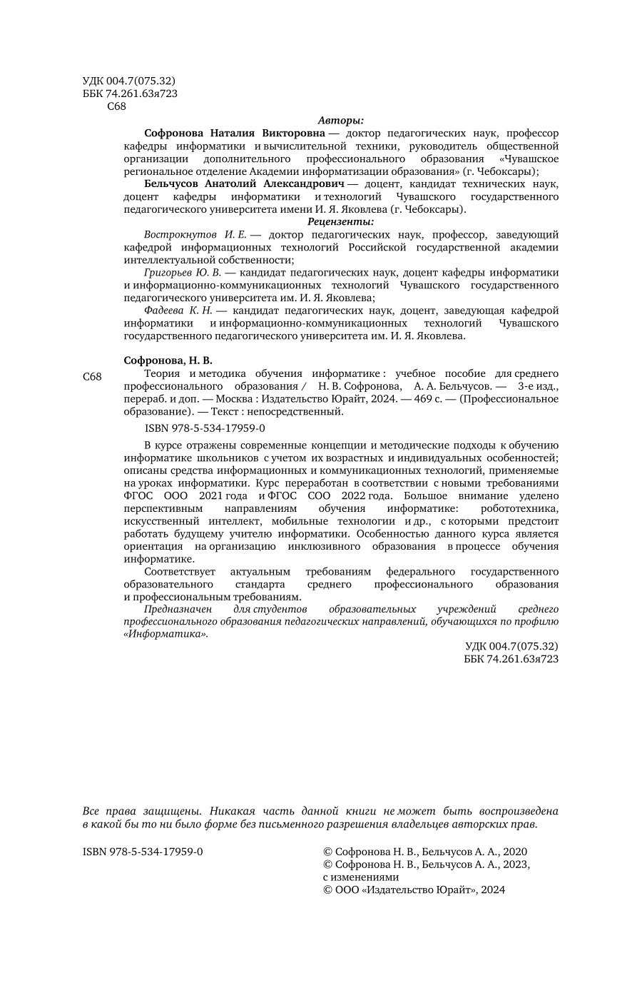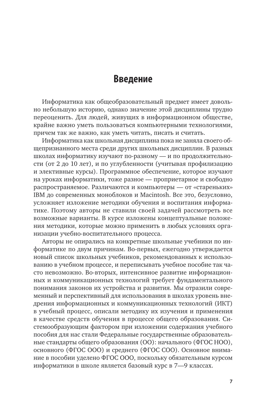 В курсе отражены современные концепции и методические подходы к обучению информатике школьников с учетом их возрастных и индивидуальных особенностей; описаны средства информационных и коммуникационных технологий, применяемые на уроках информатики. Курс переработан в соответствии с новыми требованиями ФГОС ООО 2021 года и ФГОС СОО 2022 года. Большое внимание уделено перспективным направлениям обучения информатике: робототехника, искусственный интеллект, мобильные технологии и др., с которыми предстоит работать будущему учителю информатики. Особенностью данного курса является ориентация на организацию инклюзивного образования в процессе обучения информатике. Соответствует актуальным требованиям федерального государственного образовательного стандарта среднего профессионального образования и профессиональным требованиям. Предназначен для студентов образовательных учреждений среднего профессионального образования педагогических направлений, обучающихся по профилю «Информатика».