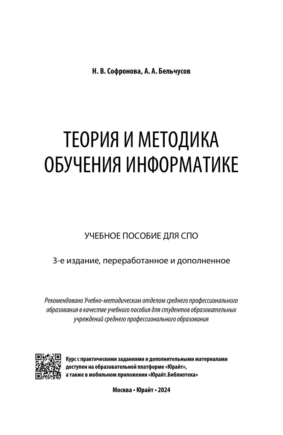 Теория и методика обучения информатике 3-е изд. пер. и доп. Учебное пособие для СПО (Анатолий Александрович Бельчусов); ЮРАЙТ, 2023