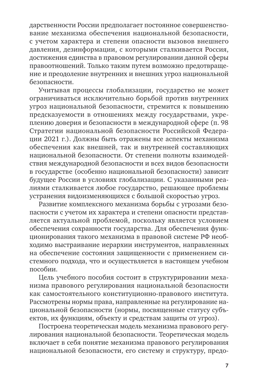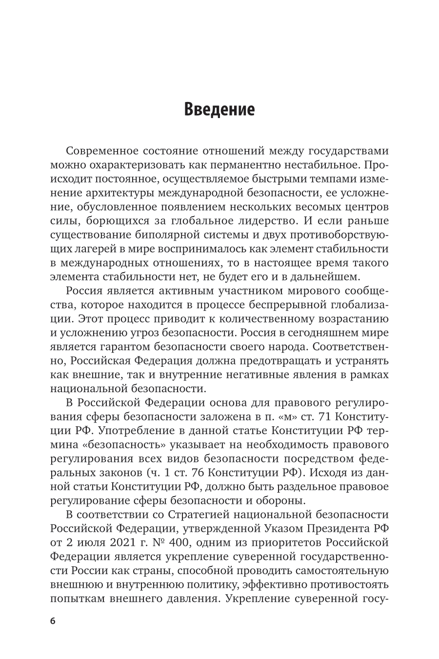 Российская Федерация должна предотвращать и устранять как внешние, так и внутренние негативные явления в рамкахнациональной безопасности. Учитывая процессы глобализации, государство не может ограничиваться исключительно борьбой против внутренних угроз национальной безопасности, оно выполняет обязательства по поддержанию международной безопасности. Развитие комплексного механизма борьбы с угрозами безопасности с учетом их характера и степени опасности представляется актуальной проблемой, поскольку является условием обеспечения сохранности государства. Для обеспечения функционирования такого механизма в правовой системе РФ необходимо выстраивание иерархии инструментов, направленных на обеспечение состояния защищенности с применением системного подхода, что и осуществляется в настоящем учебном пособии. Учебное пособие предназначено для студентов высших учебных заведений, обучающихся по юридическим направлениям