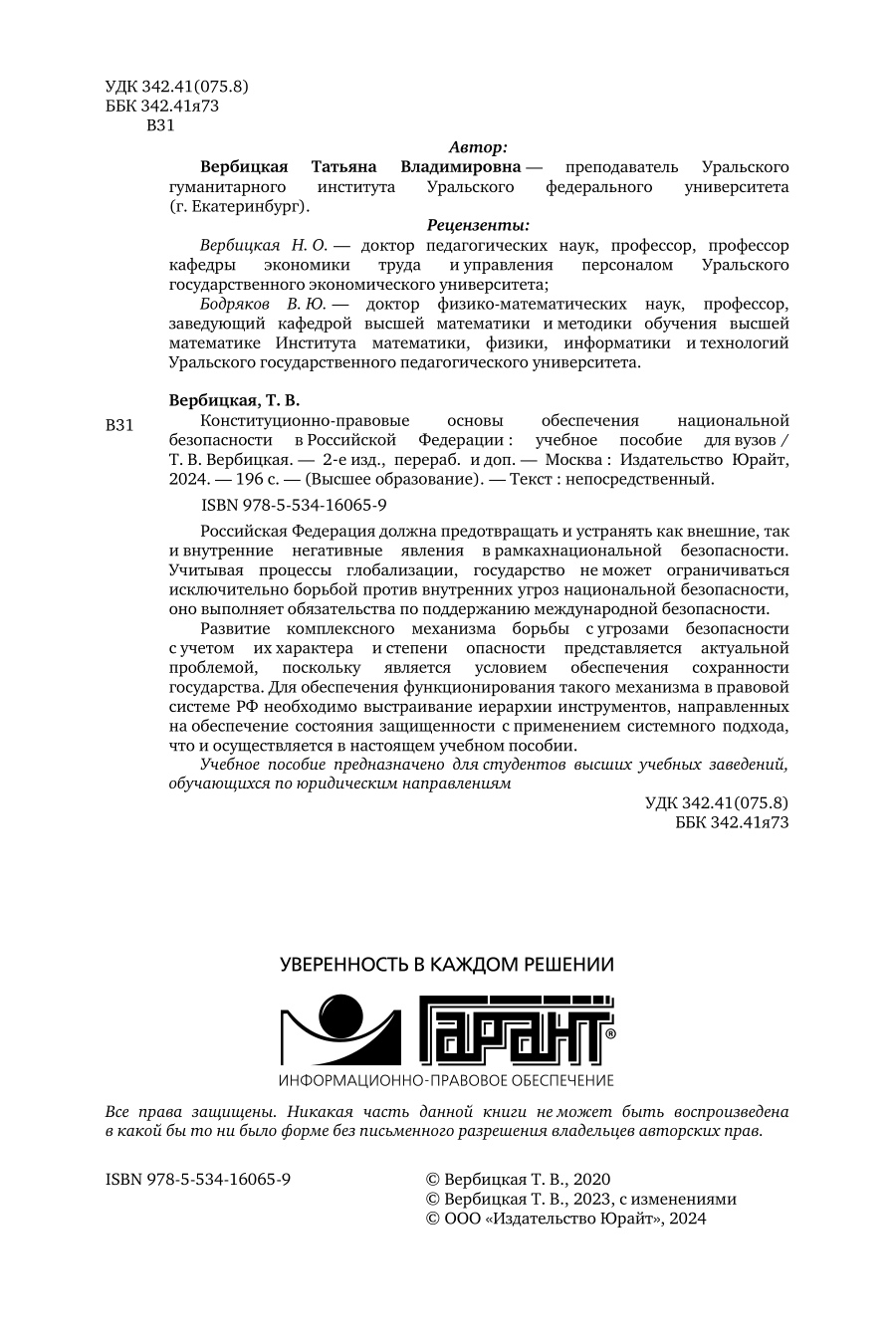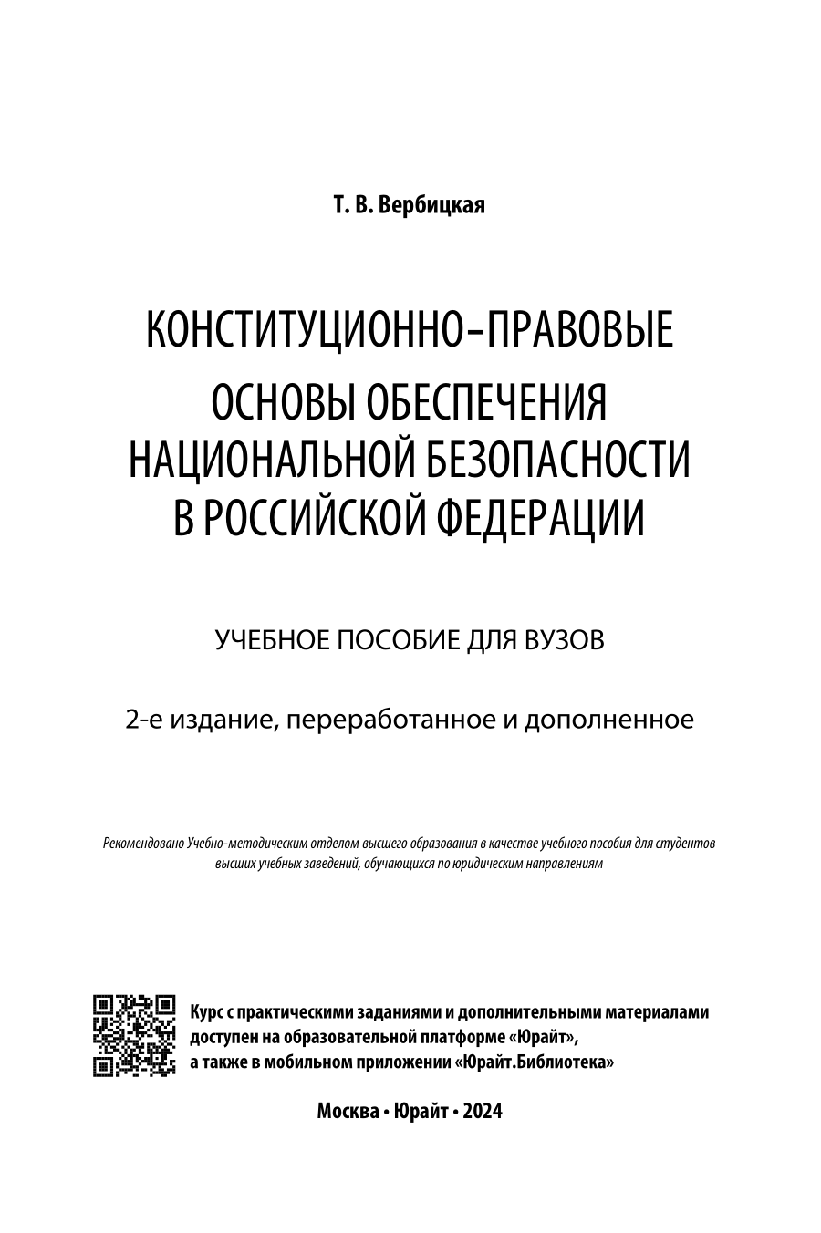 Конституционно-правовые основы обеспечения национальной безопасности в Российской Федерации 2-е изд. пер. и доп. Учебное пособие для вузов (Вербицкая Татьяна Владимировна), 2023