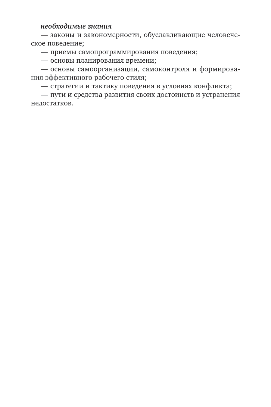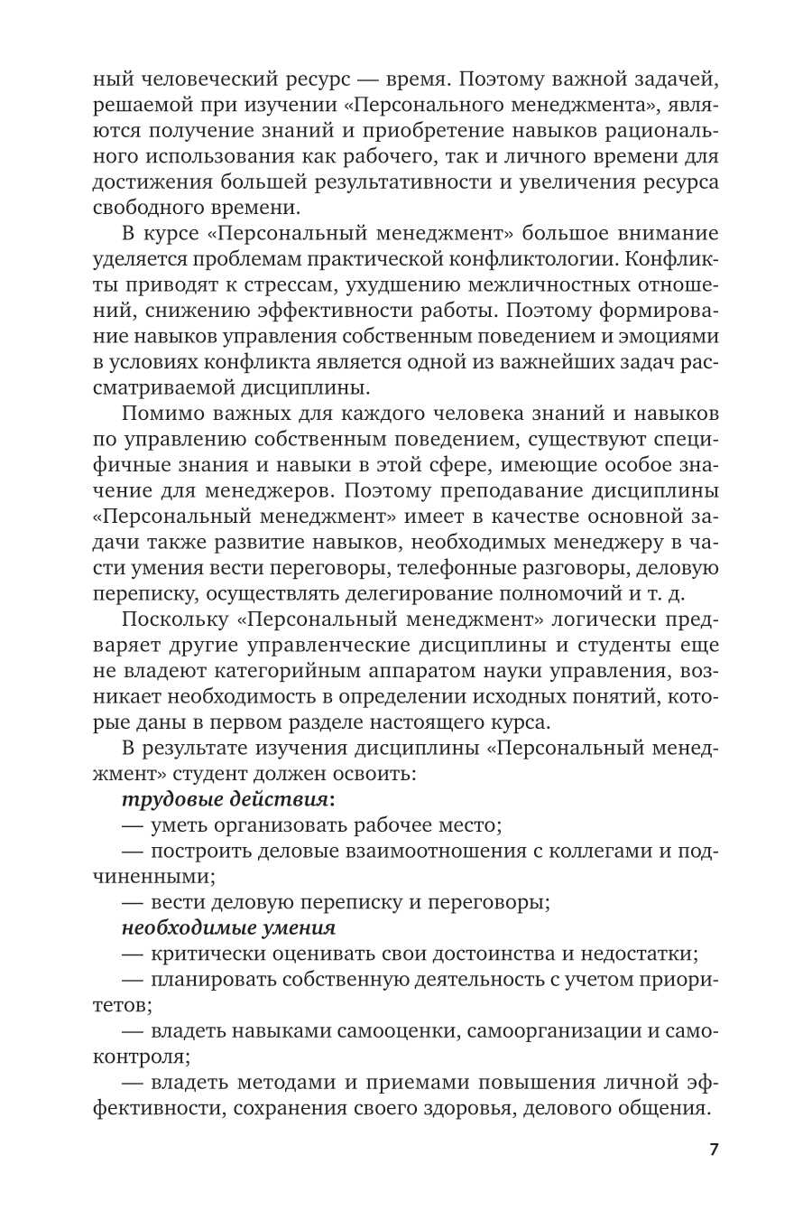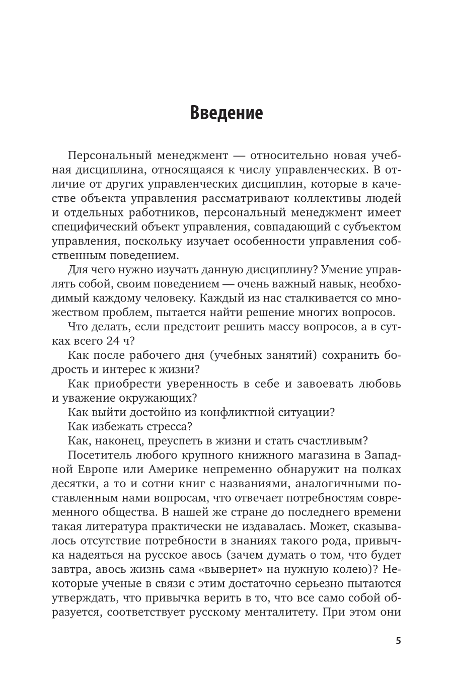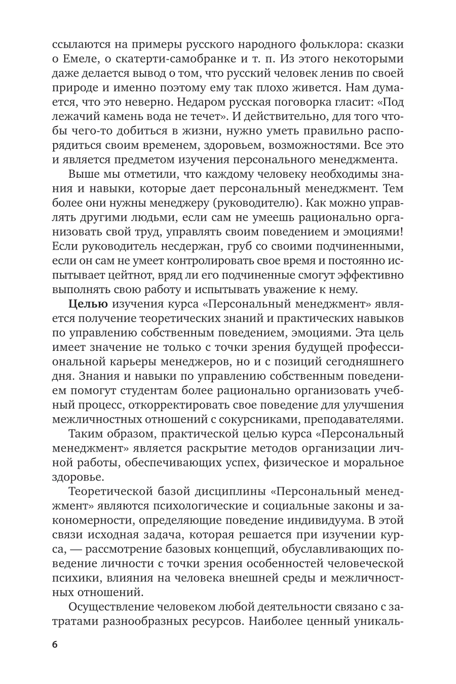 В курсе рассматриваются актуальные вопросы теории и практики персонального менеджмента. Раскрываются социально-психологические закономерности поведения человека и предлагаются практические рекомендации по управлению собственным поведением и эмоциями, в том числе в условиях конфликта. Особое внимание в курсе уделено управлению временем как важнейшей составляющей персонального менеджмента. Курс ориентирован на студентов среднего профессионального образования, слушателей программ профессиональной переподготовки и повышения квалификации, а также может быть полезен всем тем, кто заинтересован в повышении своей личной эффективности и достижении успеха.