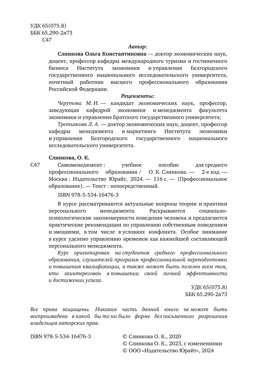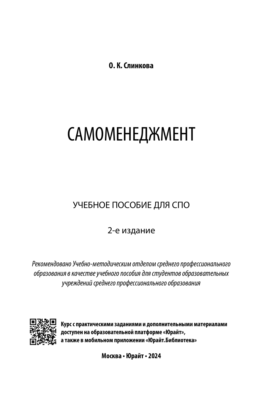 Самоменеджмент 2-е изд. Учебное пособие для СПО (Ольга Константиновна Слинкова); ЮРАЙТ, 2023