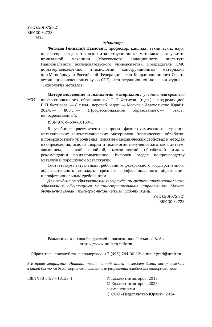 Материаловедение и технология материалов 8-е изд. пер. и доп. Учебник для СПО (Геннадий Павлович Фетисов); ЮРАЙТ, 2023