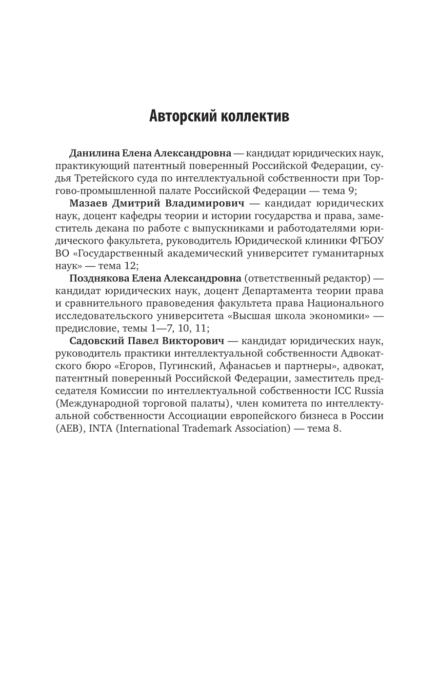 В курсе рассматриваются общее понятие интеллектуальной собственности, авторское право и его источники, объекты авторских и смежных прав, права авторов и иных лиц, смежные права, передача имущественного права, наследование исключительных прав, договоры в праве интеллектуальной собственности. Самостоятельное значение имеют также институты защиты авторских и смежных прав и ответственности за нарушение законодательства об интеллектуальной собственности. Кроме того, отдельные темы посвящены вопросам патентного права и средствам индивидуализации участников гражданского оборота, а также товаров, работ и услуг. Указанные темы рассматриваются на основе норм международных договоров, Гражданского кодекса Российской Федерации и научной разработанности. Материал предложенных тем сопровождается примерами из судебной практики. Соответствует актуальным требованиям федерального государственного образовательного стандарта высшего образования. Для студентов, обучающихся по всем направлениям и специальностям.