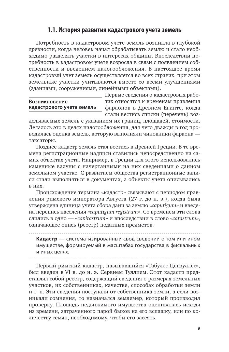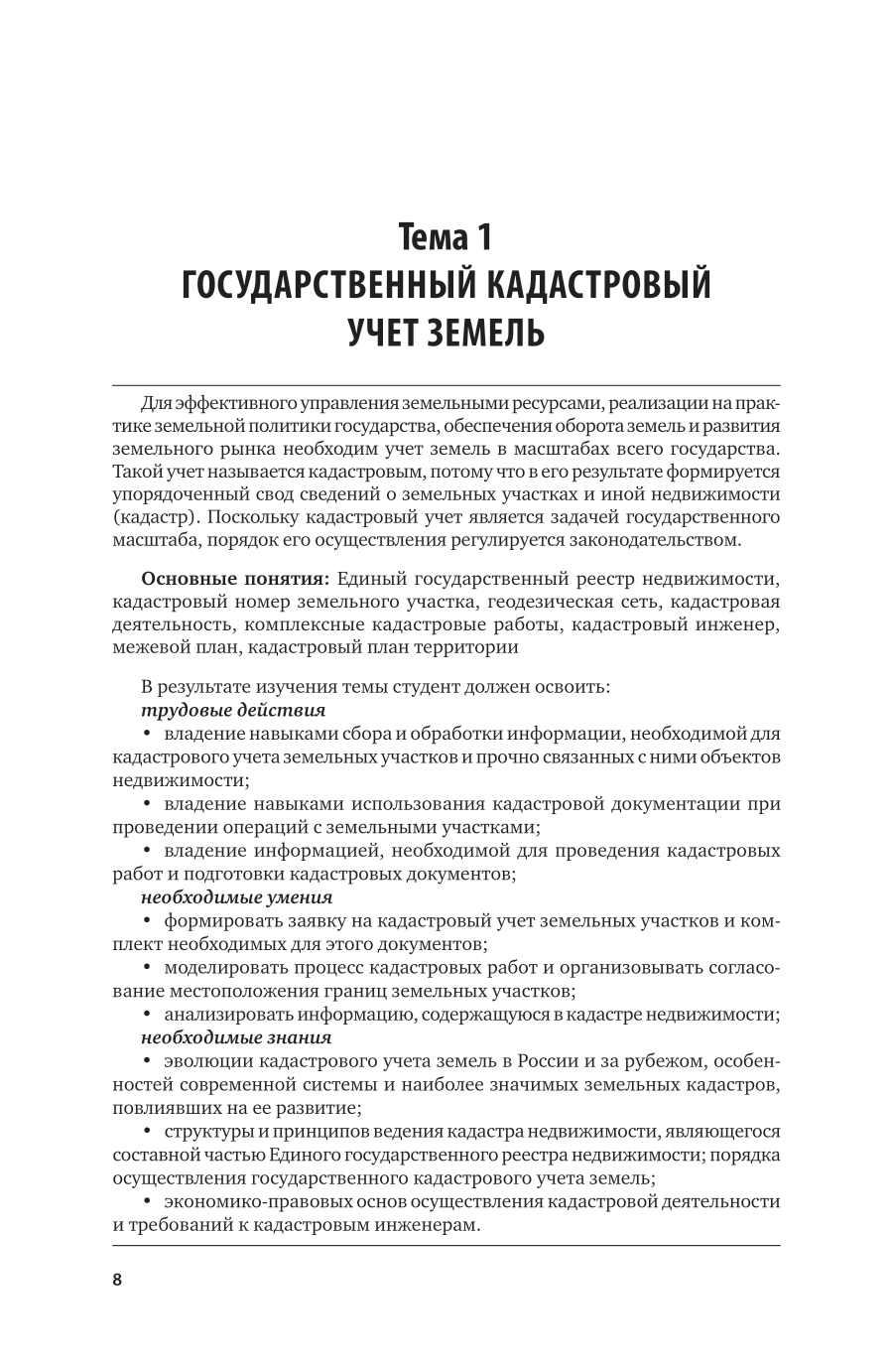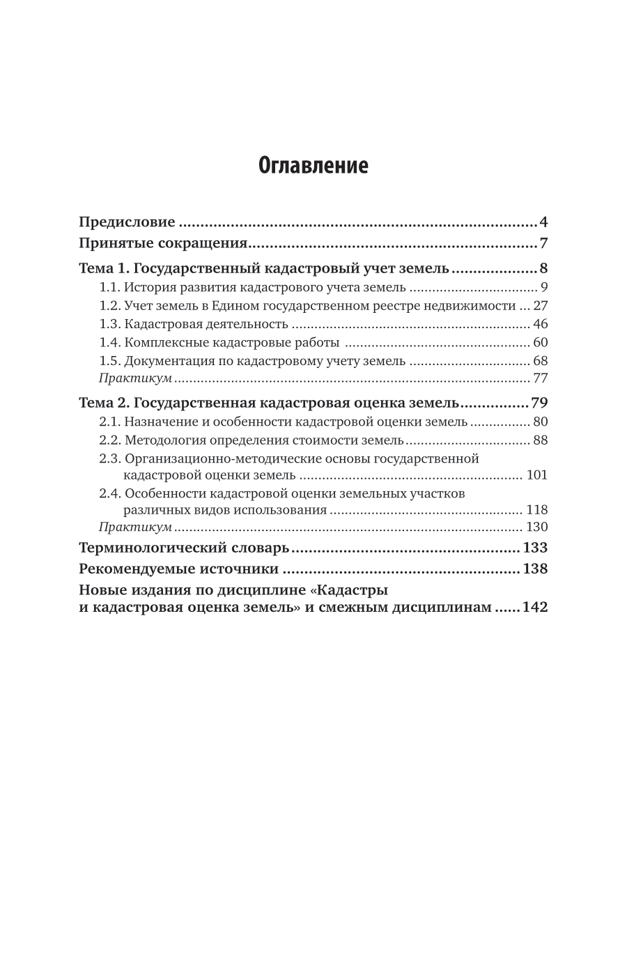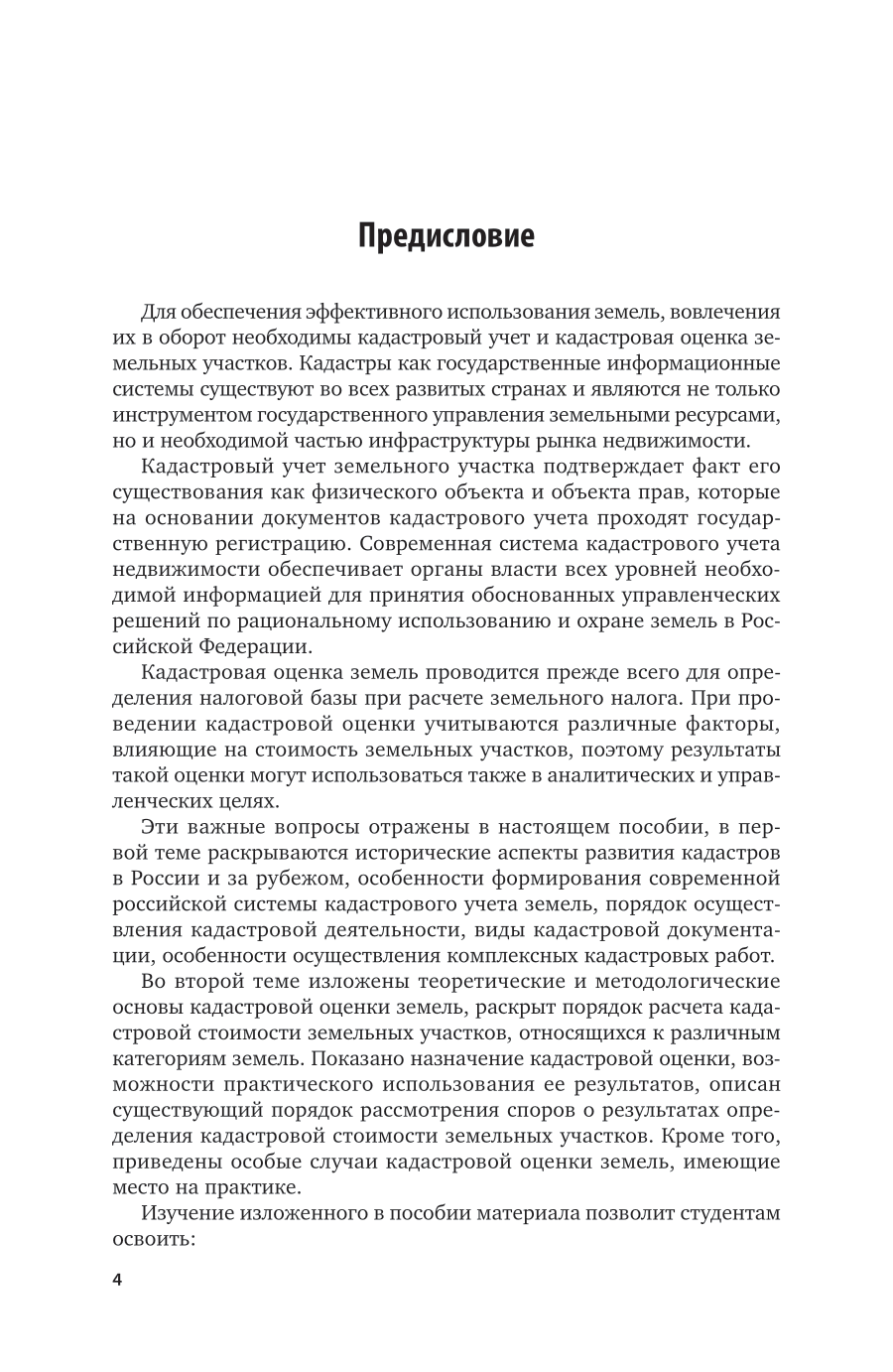 В пособии раскрыты вопросы кадастрового учета и кадастровой оценки земель. Изложены экономико-правовые основы осуществления кадастровой деятельности, эволюция кадастрового учета земель в России и за рубежом, теоретические основы кадастровой и рыночной оценки земель. При изложении материала использованы современная терминология и методы, применяемые в рассматриваемой области знаний. Для лучшего усвоения материала в конце каждой темы представлен методический комплекс, включающий контрольные вопросы для проверки знаний, расчетные задачи, кейсы, темы для подготовки докладов. Соответствует актуальным требованиям федерального государственного образовательного стандарта среднего профессионального образования и профессиональным требованиям. Для студентов образовательных учреждений среднего профессионального образования, обучающихся по специальностям «Землеустройство и кадастры», а также «Экономика» и «Менеджмент» по профилям, связанным с экономикой и управлением недвижимостью.