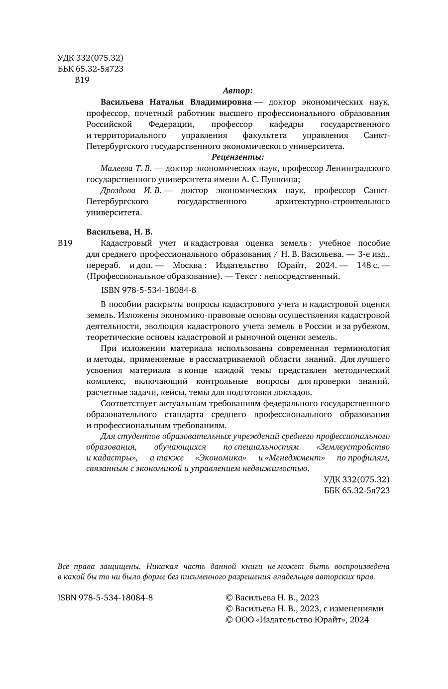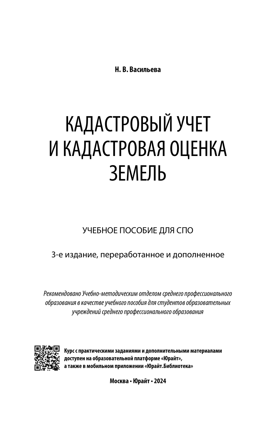 Кадастровый учет и кадастровая оценка земель 3-е изд. пер. и доп. Учебное пособие для СПО (Наталья Владимировна Васильева); ЮРАЙТ, 2023