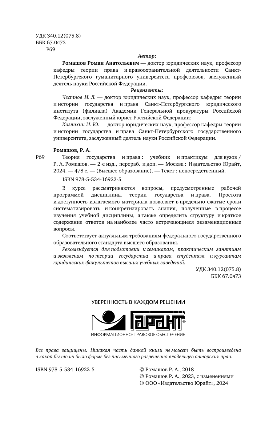 Теория государства и права 2-е изд. пер. и доп. Учебник и практикум для вузов (Роман Анатольевич Ромашов); ЮРАЙТ, 2023