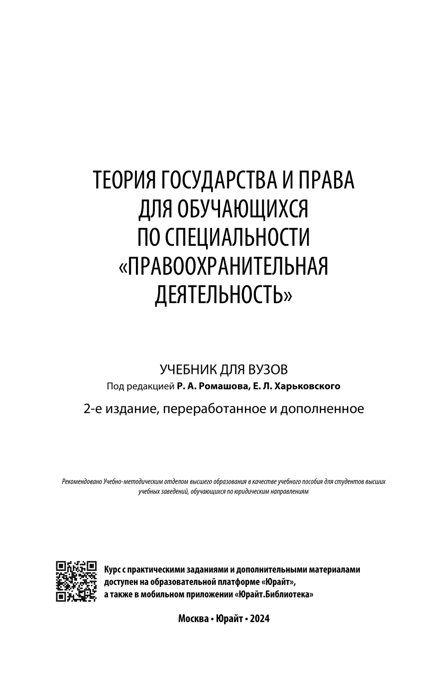 Теория государства и права для обучающихся по специальности «правоохранительная деятельность» 2-е изд. пер. и доп. Учебник для вузов (Ромашов Роман Анатольевич, Харьковский Евгений Леонидович), 2024