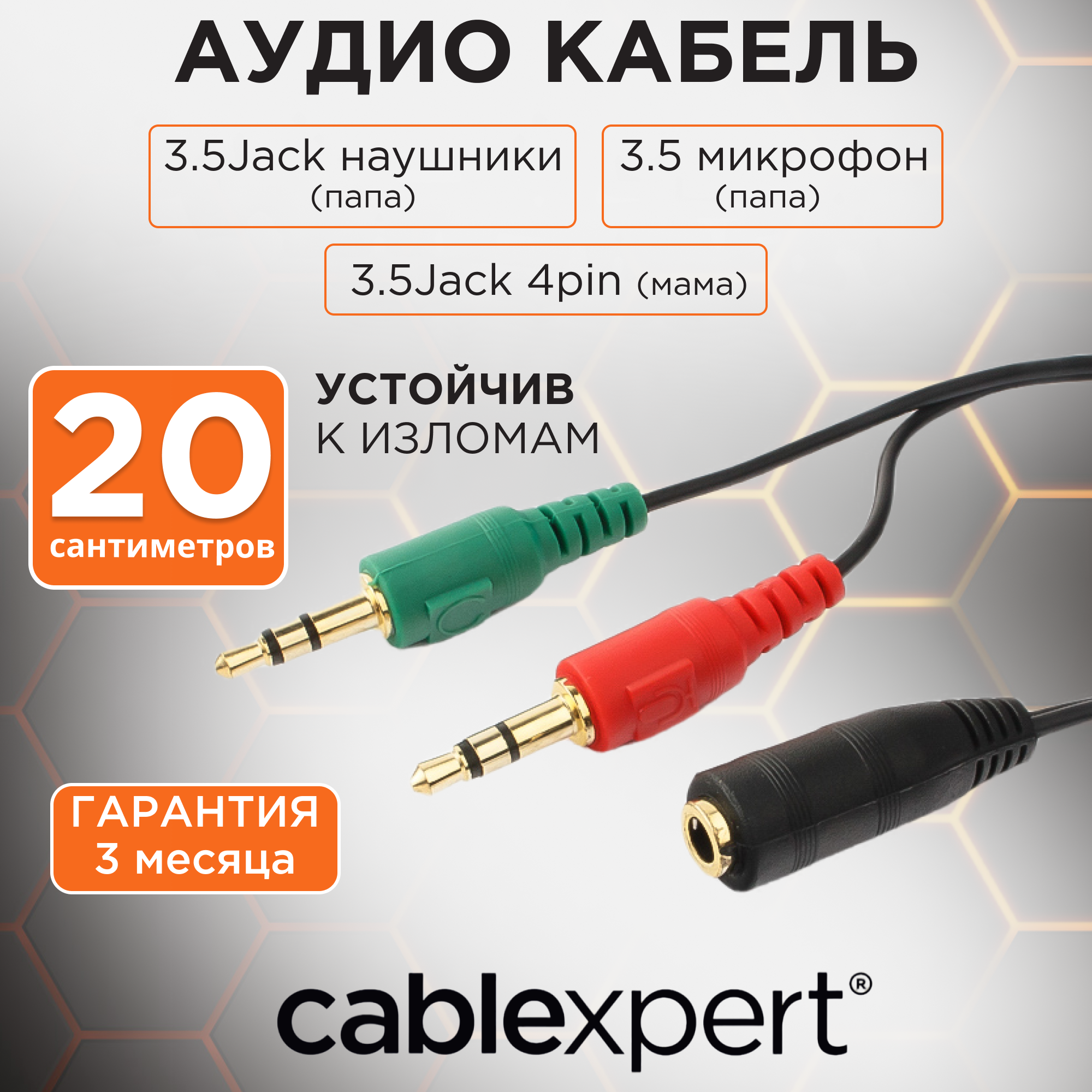 Кабельная продукция Cablexpert уже давно очень хорошо зарекомендовала себя в Европе благодаря отличному качеству, соответствию всем необходимым стандартам и невысокой цене. В результате ежемесячно стали продаваться миллионы кабелей под ТМ Cablexpert. Продукция Cablexpert сертифицируется в соответствии с самыми строгими нормами качества стран Евросоюза (ISO, RoHS, TUV, VDE и т. д.). Уверенность в качестве выпускаемых изделий стала предпосылкой для предоставления пожизненной гарантии на весь ассортимент кабельной продукции торговой марки Cablexpert. Кабель аудио-переходник 4-х контактной 3.5 мм вилки на две 3.5 мм розетки (стерео аудио + моно микрофон) Особенности Комбинированный аудио кабель: 4-х контактная 3.5 мм розетка на две 3.5 мм стерео вилкиДля подключения 4-х контактной гарнитуры к компьютеруПозолоченные контакты