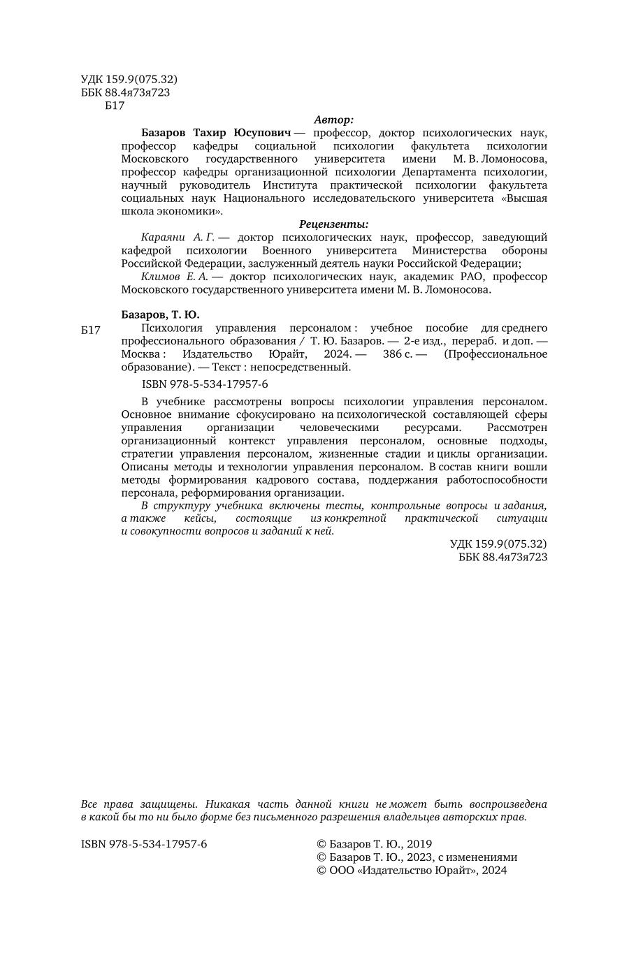 Психология управления персоналом 2-е изд. пер. и доп. Учебное пособие для СПО (Тахир Юсупович Базаров); ЮРАЙТ, 2023