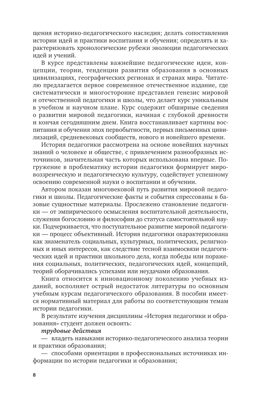 Курс отличается насыщенностью фактического материала, оригинальным стилем изложения, глубиной авторского анализа. Он представляет собой результат многолетнего кропотливого труда ученого-педагога. В курсе рассмотрена история мировой и отечественной педагогики с древнейших времен до XX и XXI веков. Тенденции развития педагогической мысли и образования в России и в мире анализируются как целостный и взаимосвязанный процесс. Представлены ведущие педагогические идеи, концепции, теории, направления эволюции образования.