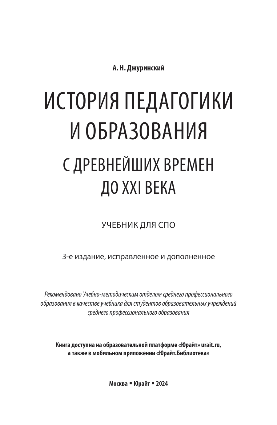 История педагогики и образования. С древнейших времен до XXI века 3-е изд. испр. и доп. Учебник для СПО (Александр Наумович Джуринский); ЮРАЙТ, 2024